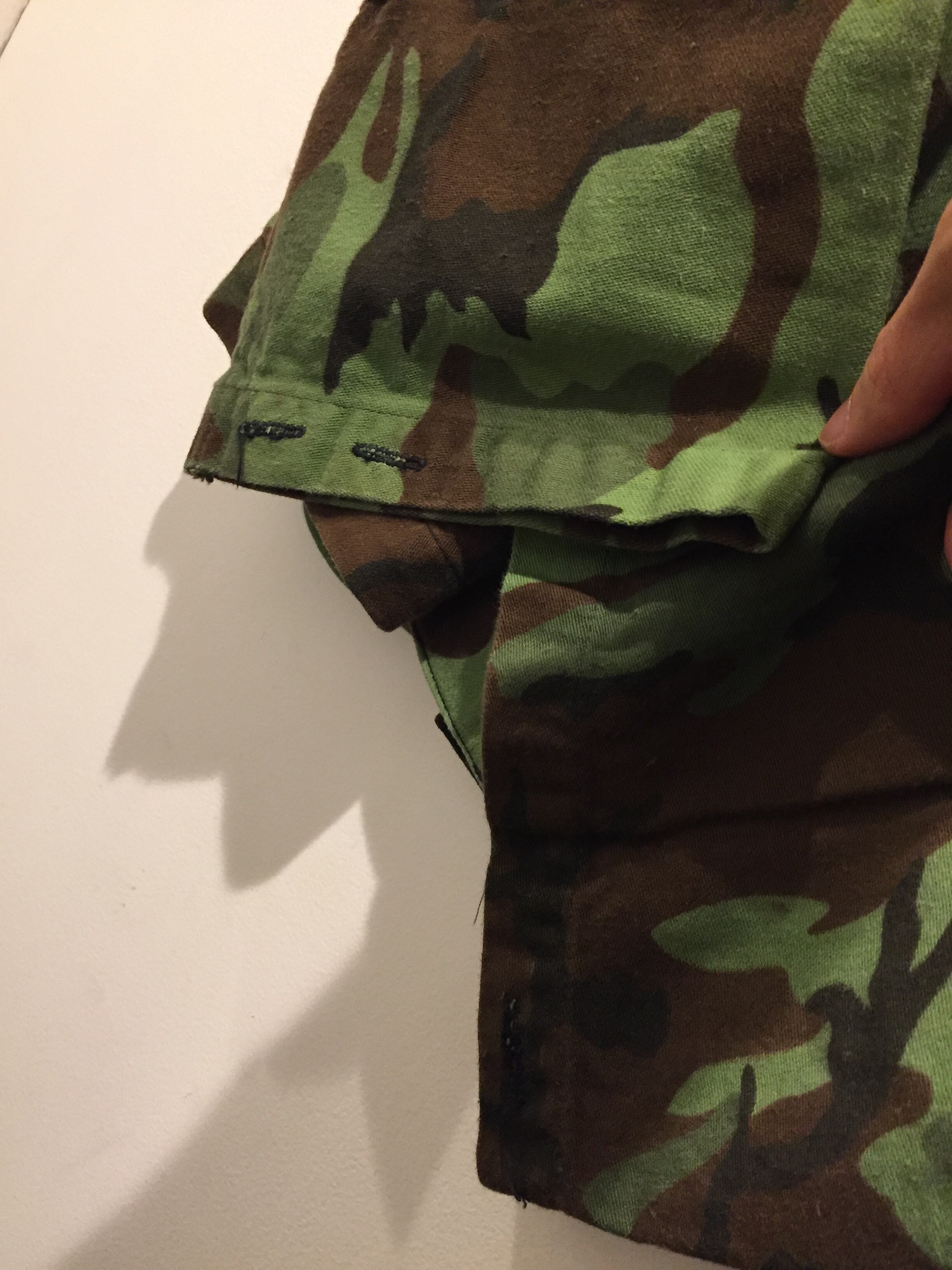 こちらは60年代のベトナム戦ARVN M-59パステルリーフジャケットです。ARVN(Army of the Republic of Vietnam)の略で、南ベトナム軍を表します。形はM-59と言われるもので肩のエポレットとショルダーパッチ、袖のエルボーパッチが特徴です。生地はパステルリーフと呼ばれるタイプで、コットンサテン地に発色の良いカモフラ柄が入ります。襟下には少し薄くなってるところもございますがT.T.S.X.Q.T(南ベトナム軍被服廠)のスタンプが入り、サイズはA5、製造年は68or69年9月と読み取れます。このスタンプがあるのは重要なポイントですね。またこちらのジャケットには複数の生地違いや型違い、パンツ等も存在しますので昔からコレクターアイテムとなっています。存在自体は知っている方も多いですが、実際店頭などではあまり見かける物でもなく、とても希少なアイテムとなります。サイズも元々ベトナム人サイズで作られていますので、A5という大きめサイズも希少ですね。着用はもちろんですがコレクションやデザインソース、資料としてもオススメな1着です。タイガーストライプやベトジャンはまだ見かけますがこちらは本当見かけなくレアアイテムです。