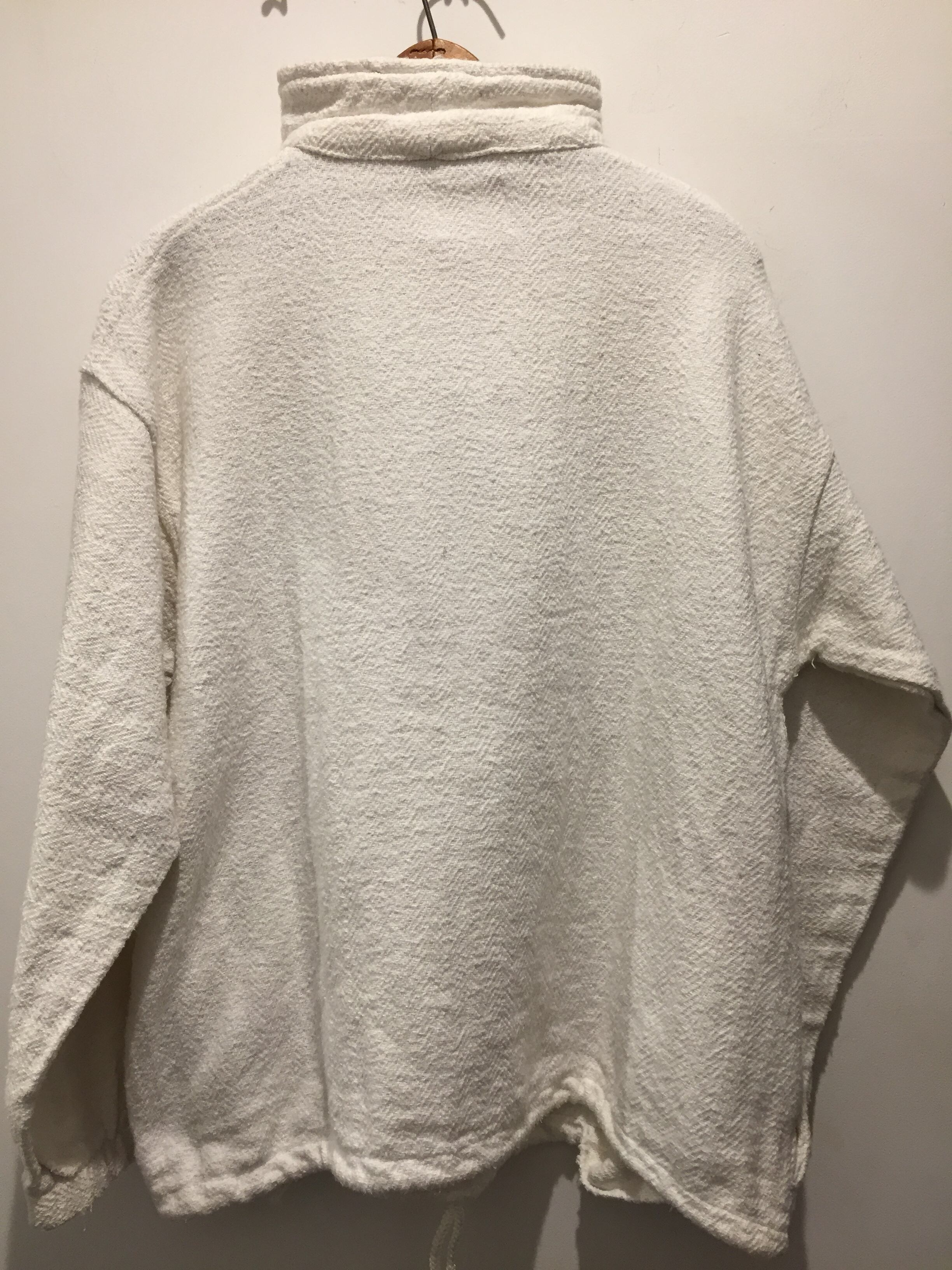 アメリカのフロリダ州はウエストパームビーチのラマテックス社が展開するラグブランド「アースラグズ」このブランドはメキシカンパーカーも多く作っていますね。このメキシカンパーカーはオフホワイトの無地です。無地も玉数少なく珍しいのですが更にハーフジップのハイネックでフードが無いのが珍しいですね。フロントにポケットは無くサイドポケットが付きます。最近ではメキシカンパーカーはハイブランドも真似するほど注目されたアイテムですね。またアースラグズの商品には「商品を購入することで環境に対する意識を高め、環境保護に貢献して欲しい」というブランド理念が込められているそうで、こだわりがありそういったのも惹かれるポイントですね。