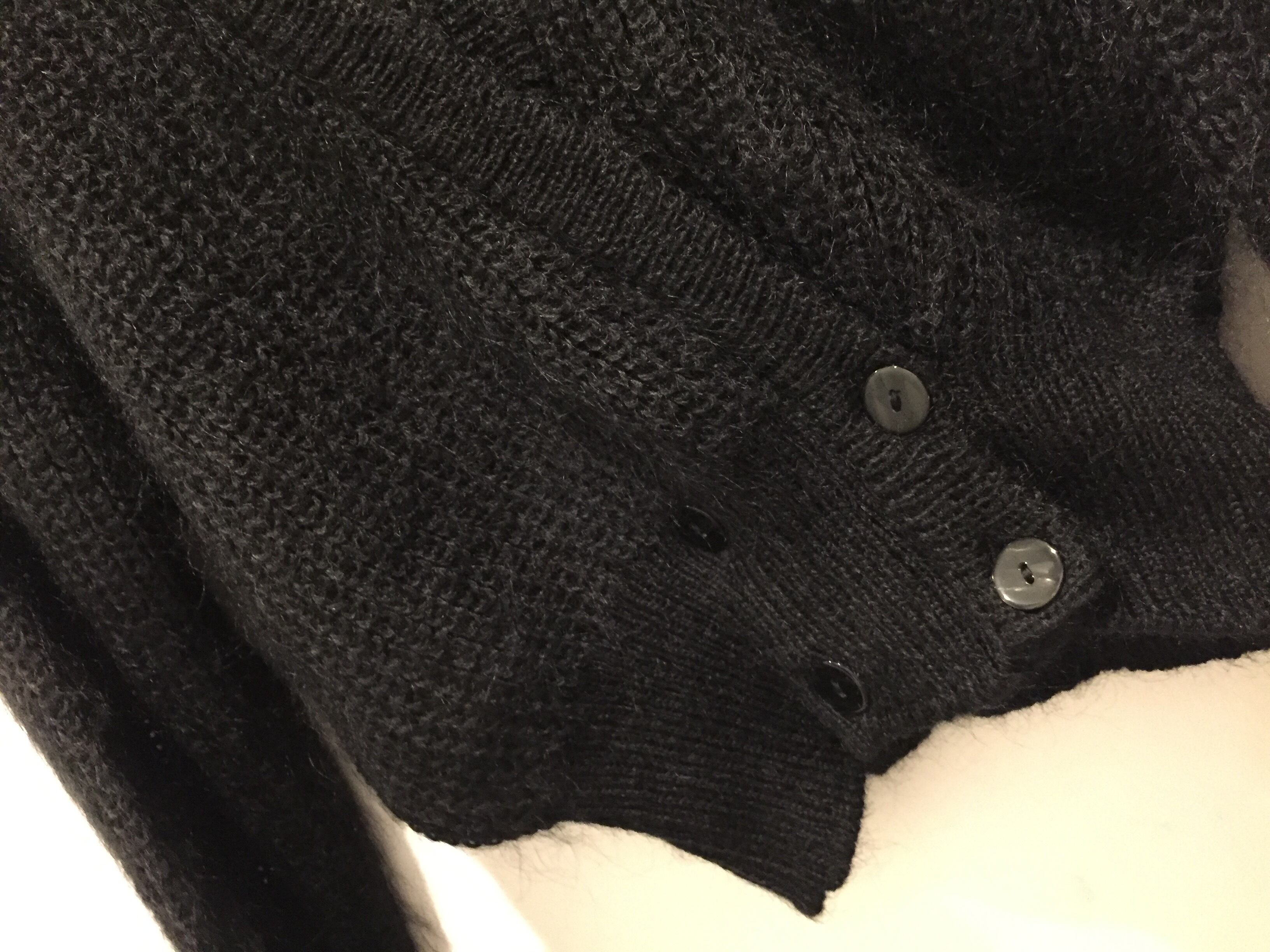 メンズでは人気の高いビンテージの黒モヘア。こちらはレディースアイテムの黒モヘアでイギリス製のお洒落な1着です。50%モヘアと贅沢な生地感で毛足が長く裾リブでダブルになっておりシルエットも良く開閉どちらでも良い感じになります。予備のボタンも内側に1つ付属しているのも嬉しいポイントですね。