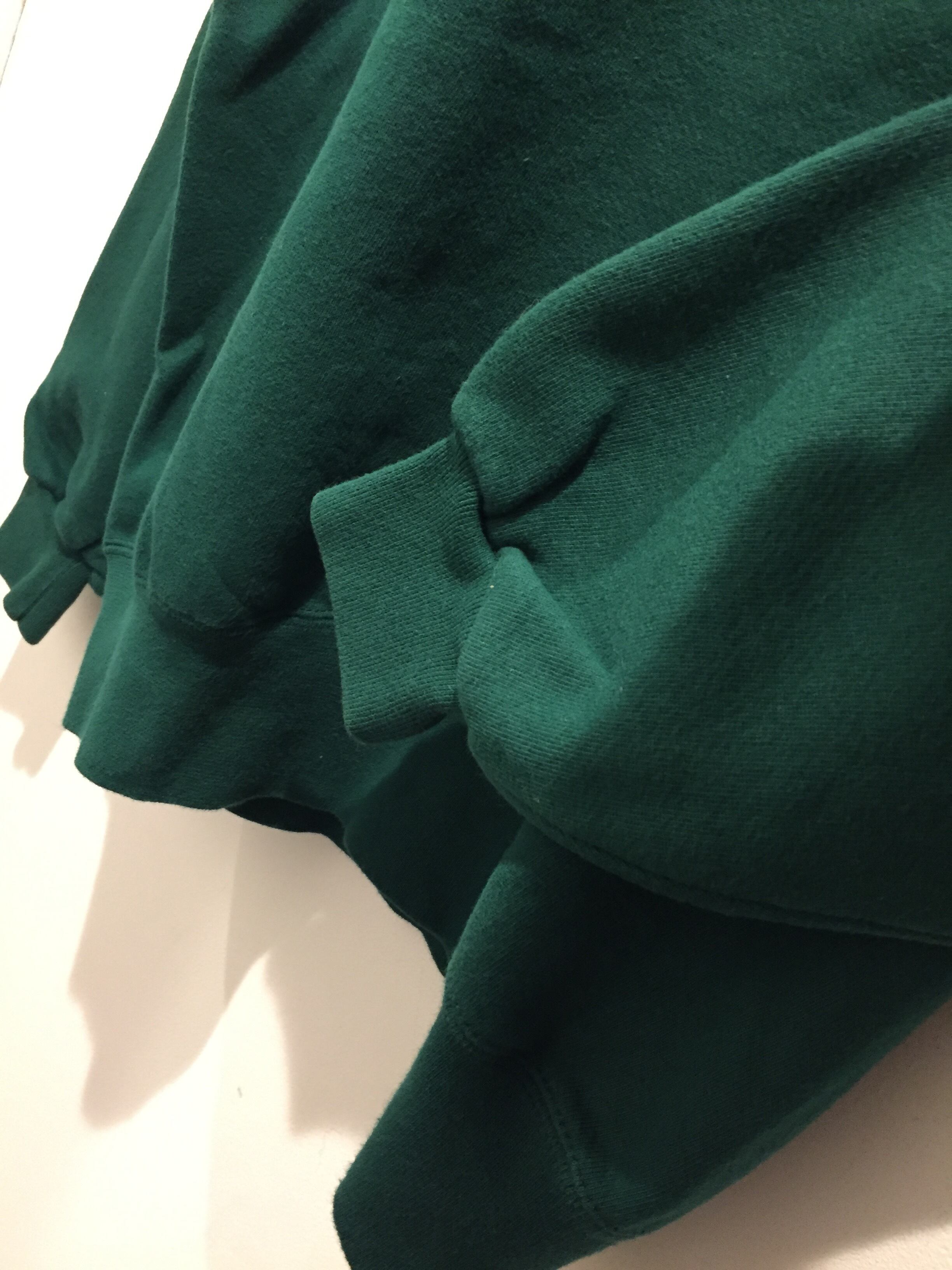 70年〜80年代の物でカラーはダークグリーンとなります。L.L.Beanとラッセルと有名ブランドのWネームとタグだけでも惹かれるポイントですね。デザインはシンプルに無地で前Vのガゼットとプレーンなスウェットで合わせやすく使える1着で老若男女オススメです。95%コットンで生地もしっかりめで丈夫な作りとなっています。