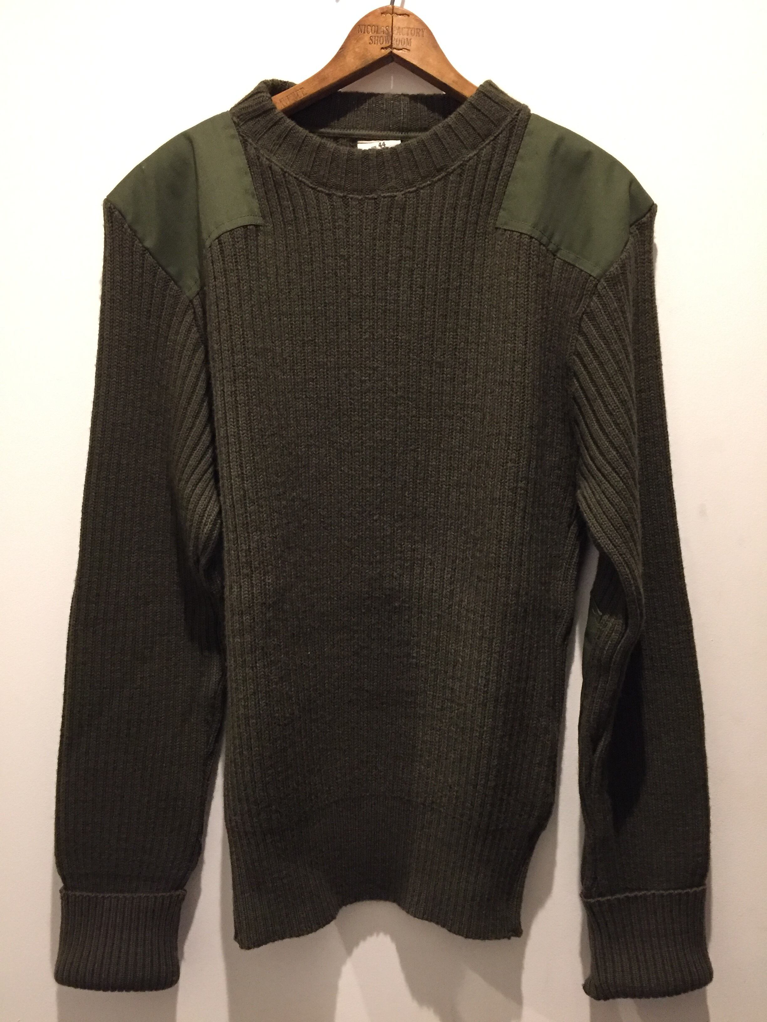 カラーはカーキです。素材にはウールを使用しインナーとしての着用が考慮されている為、身体にフィットするよう伸縮性に優れた特有の編み方となっています。肩と肘には補強の為の別生地があしらわれていて機能性も抜群な1着です。袖は長めに作られていて折り曲げて調整できるようになっています。一見シンプルですがいろいろと考えられたアイテムでハイブランドのサンプルとしても使われそうな1点ですね。