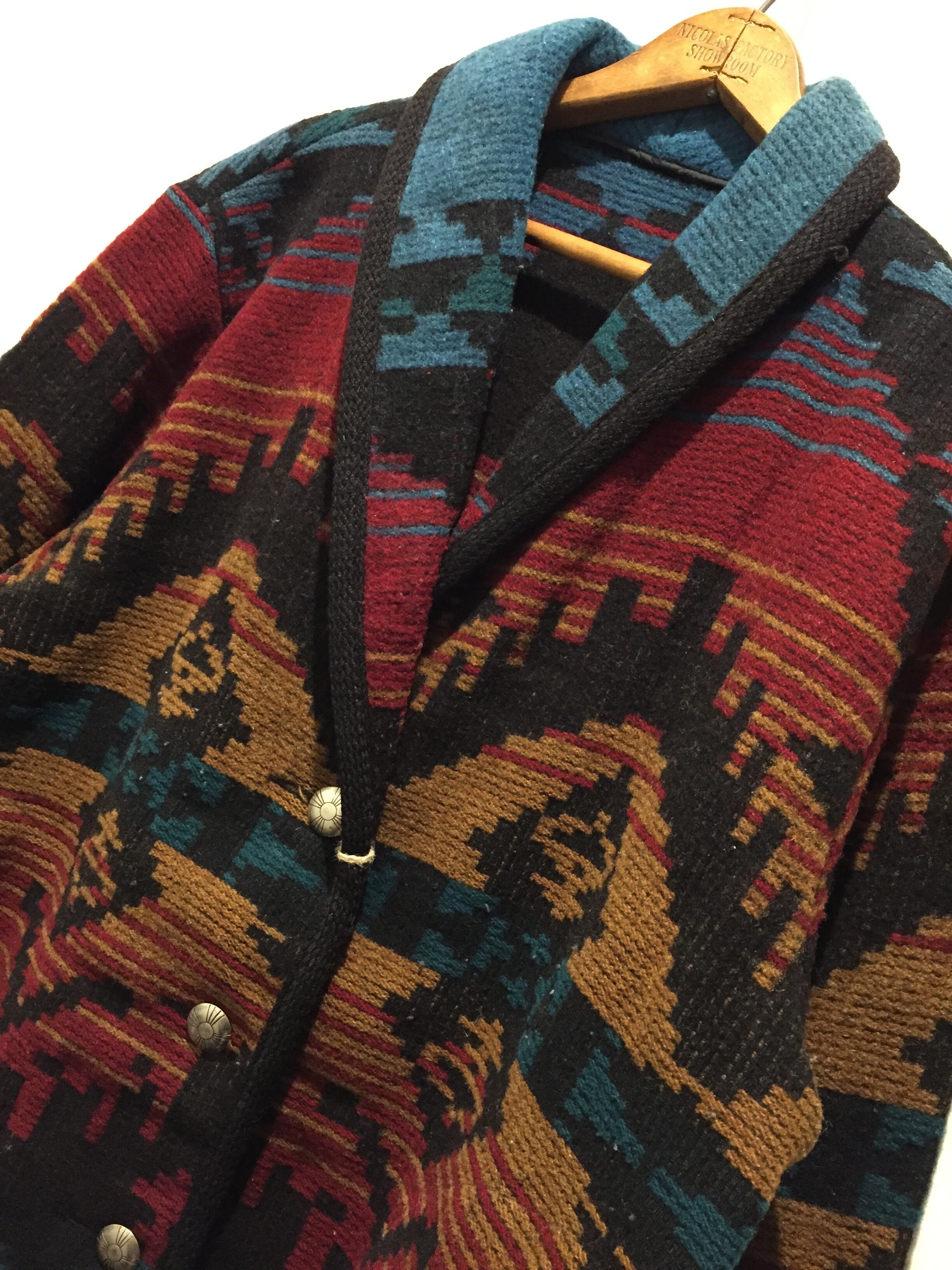 メインのタグはないのですが小さいタグから80年代のウールリッチかL.L.Beanの物と思われます。ショールカラーのネイティブパターンでとてもかっこいい1着です。ボタン合わせがレディースですが大きめな作りでメンズのサイズ感です。ラルフのネイティブパターンは人気ですがこの辺はまだ目をつけている人が少なく今のうちに狙っておくと良いですね。
