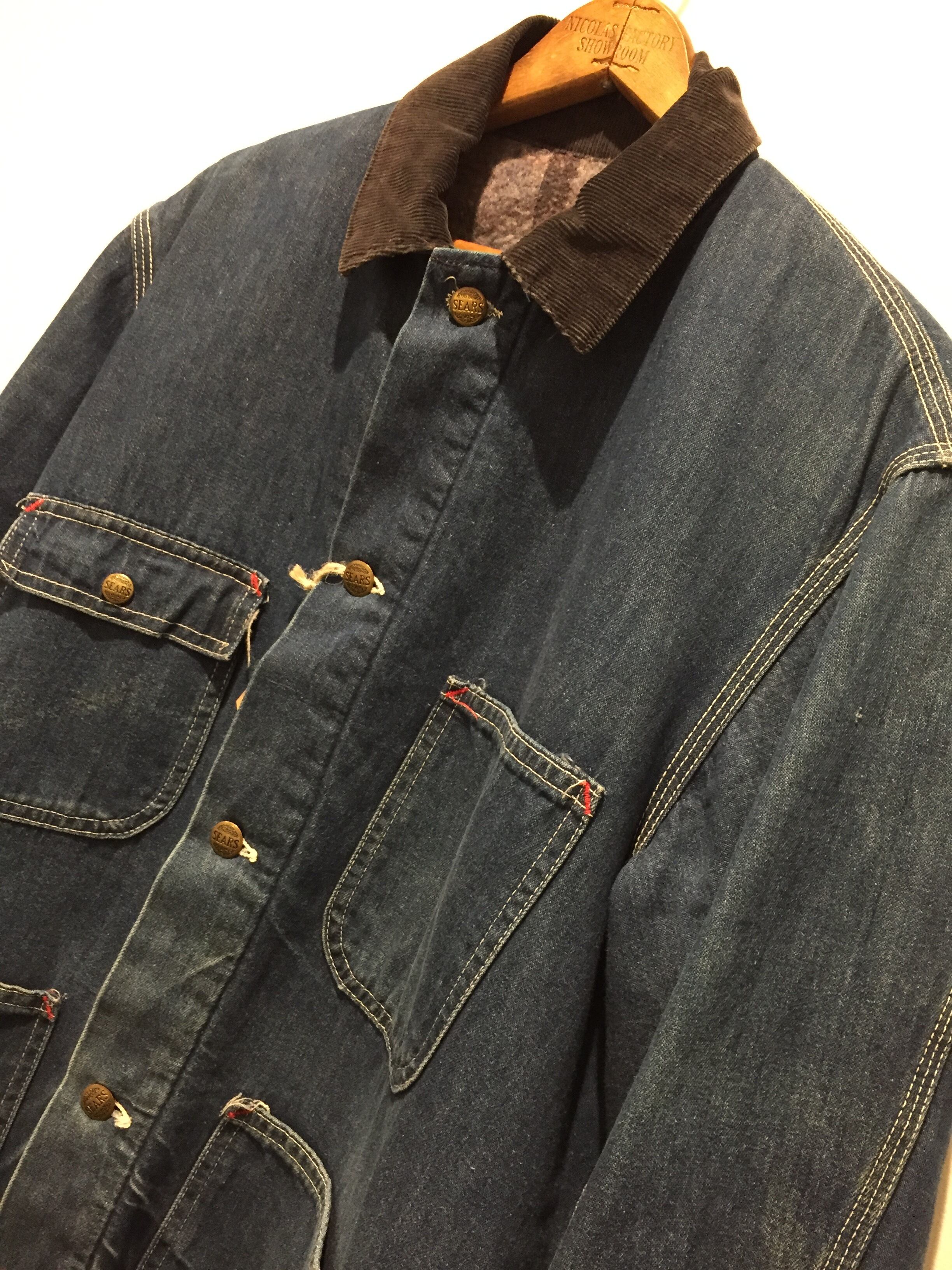 70年代のシアーズのデニムカバーオールです。裏地にブランケット付きで衿だけコーデュロイ仕様になります。胸ポケットは片方フラップ付きと左右非対称なのが良いですね。色も8割ほど残っており袖には薄っすらとヒゲが出ていて綺麗な縦落ち具合です。ブランケット付きなので暖かく着用できるのもポイントですね。