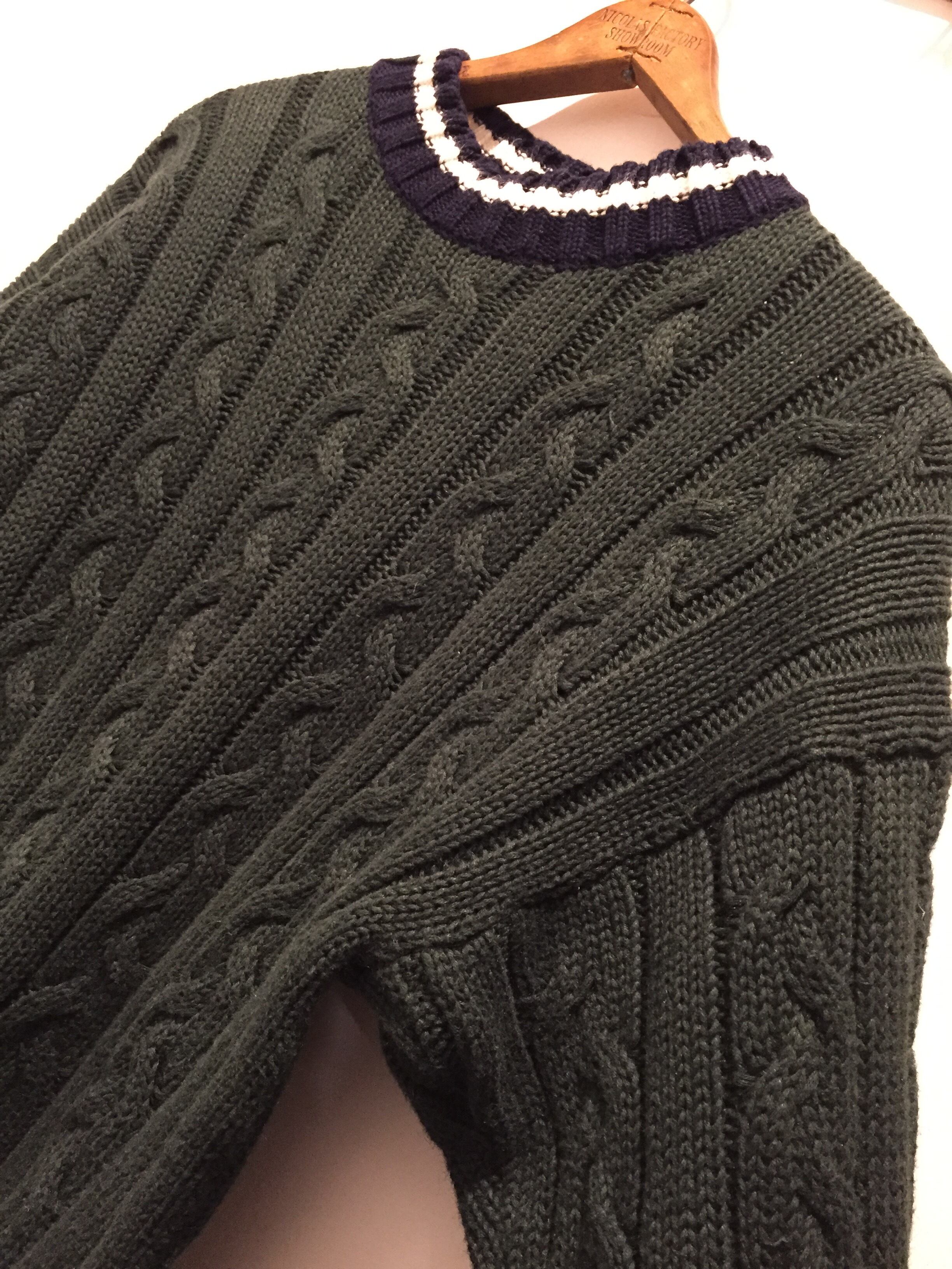 カラーはグリーンです。90年代のOLD GAPはデザインも良く質の良いものが多くありNEXTヴィンテージとしても注目を浴びていますね。こちらのデザインはケーブル編みに首のリブと袖にラインの切り返しがポイントで配色も良いです。メンズSサイズなので女性が少しゆったり着用しても良いサイズ感です。コットン×麻素材なのでチクチクしないのも着やすくて良いですね。インナーにBDシャツをレイヤードしてもオススメです。