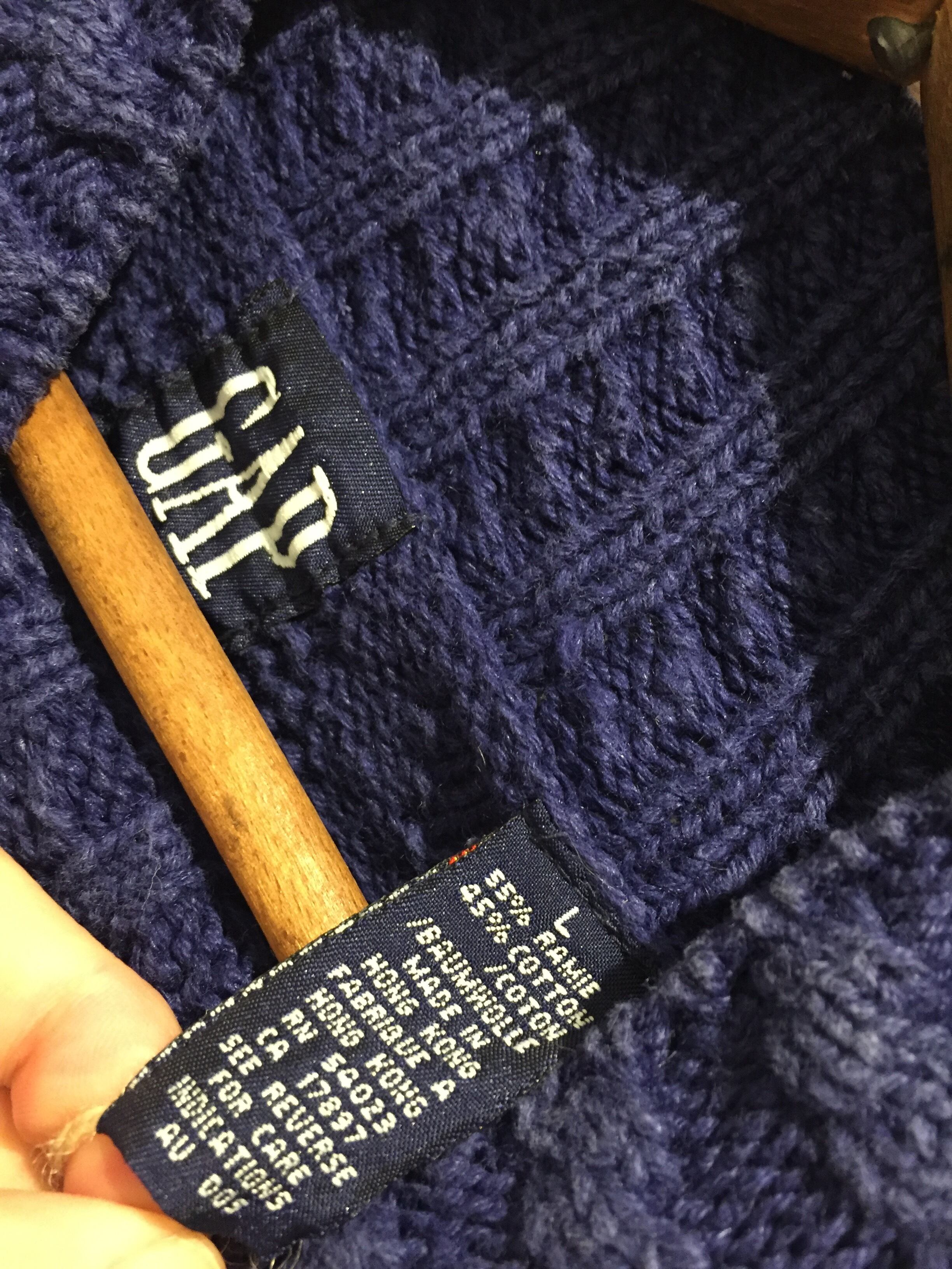 カラーはネイビーです。90年代のOLD GAPはデザインも良く質の良いものが多くありNEXTヴィンテージとしても注目を浴びていますね。こちらのデザインは単色のアーガイルのようなデザインにさらに模様が入ってとても良いデザインとなっています。Lサイズですがそこまで大きくなく女性が少しゆったり着用しても良いサイズ感です。ハイネックですがコットン×麻素材なのでチクチクしないのも着やすくて良いですね。