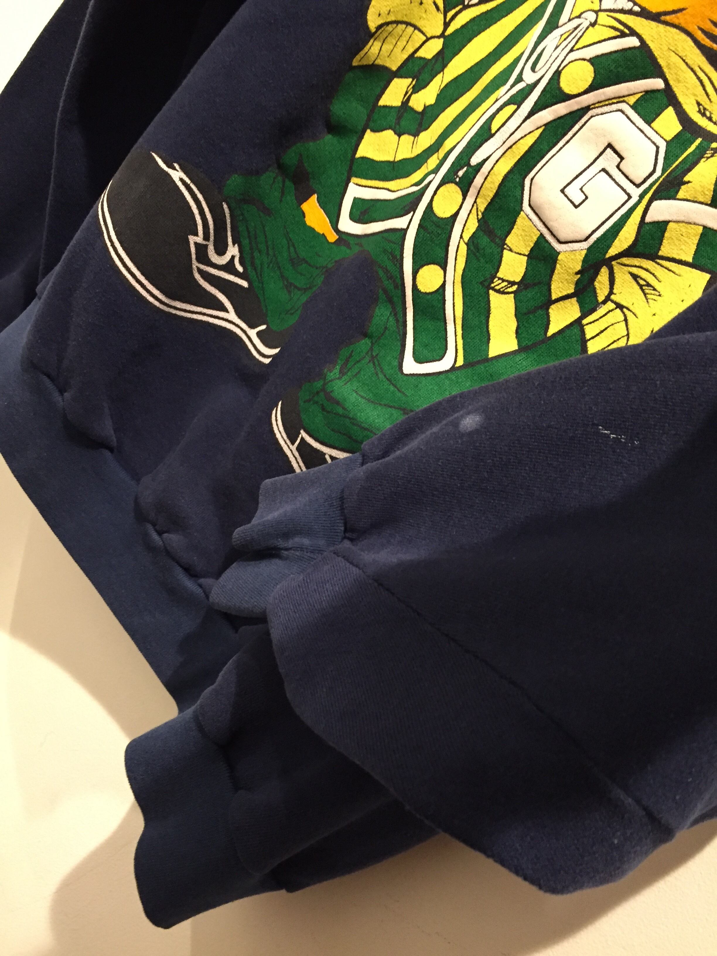 アメリカで1978年に登場したガーフィールド。アメリカだけで無く全世界でも人気がありますね。ネイビーボディでリブのトーンが変わりツートン仕様となっています。フロントに大きくガーフィールドがデザインされていてインパクトある1着です。ストリートの格好をしているのが可愛いですね。サイズ表記はございませんが大きめなサイズ感で男女共にオススメです。
