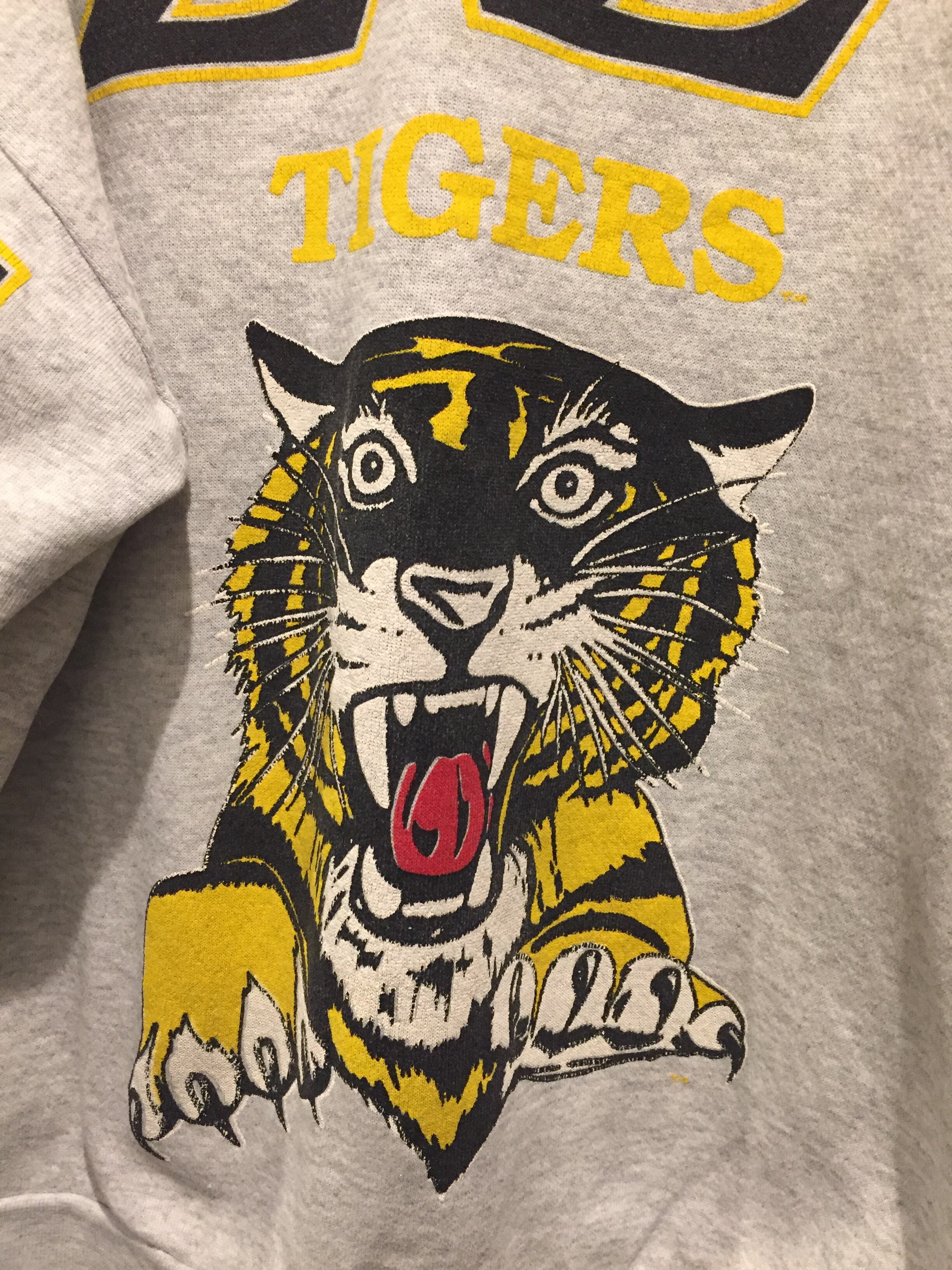 カラーは霜降りのグレーとなります。アメリカはミズーリ大学のバスケットボールチームでミズーリタイガースのスウェットとなります。フロントまで入るロゴのプリントと虎のプリントが迫力がありカッコイイ1着です。男女ともにオススメなアイテムですね。