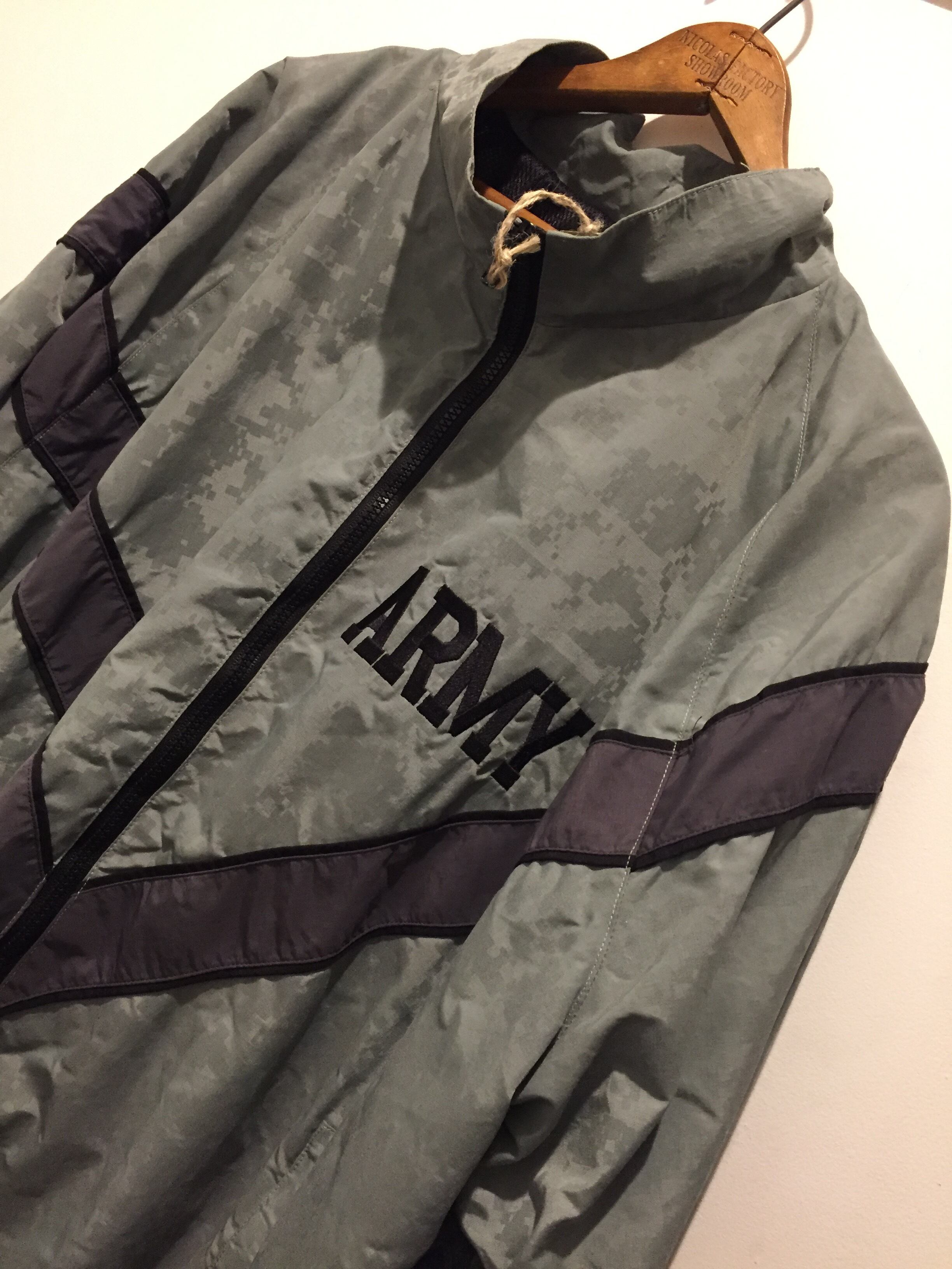 アメリカ軍のトレーニングジャケットです。グレーカラーにV字のリフレクターとシンプルですがかっこいい1着ですね。脇下のアジャスターやサイドポケットにもジッパー付きと機能面もバッチリです。デジカモバージョンでL-LONGと大きめなサイズ感も良くロング丈はあまり見ませんね。デッドストックに近いコンディションで女性の方にもオススメです。