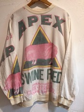 アメリカらしい大胆なデザインで、染み込みプリントでPig柄の色使いも最高な1着です。生成りのコットンベースで生地もしっかりしています。左袖のみ柄が入らず、左右比対称というのもポイントです。大きめな作りなのでスキニーパンツにゆったりめに合わせると存在感も出ますね。男性、女性問わずオススメです。