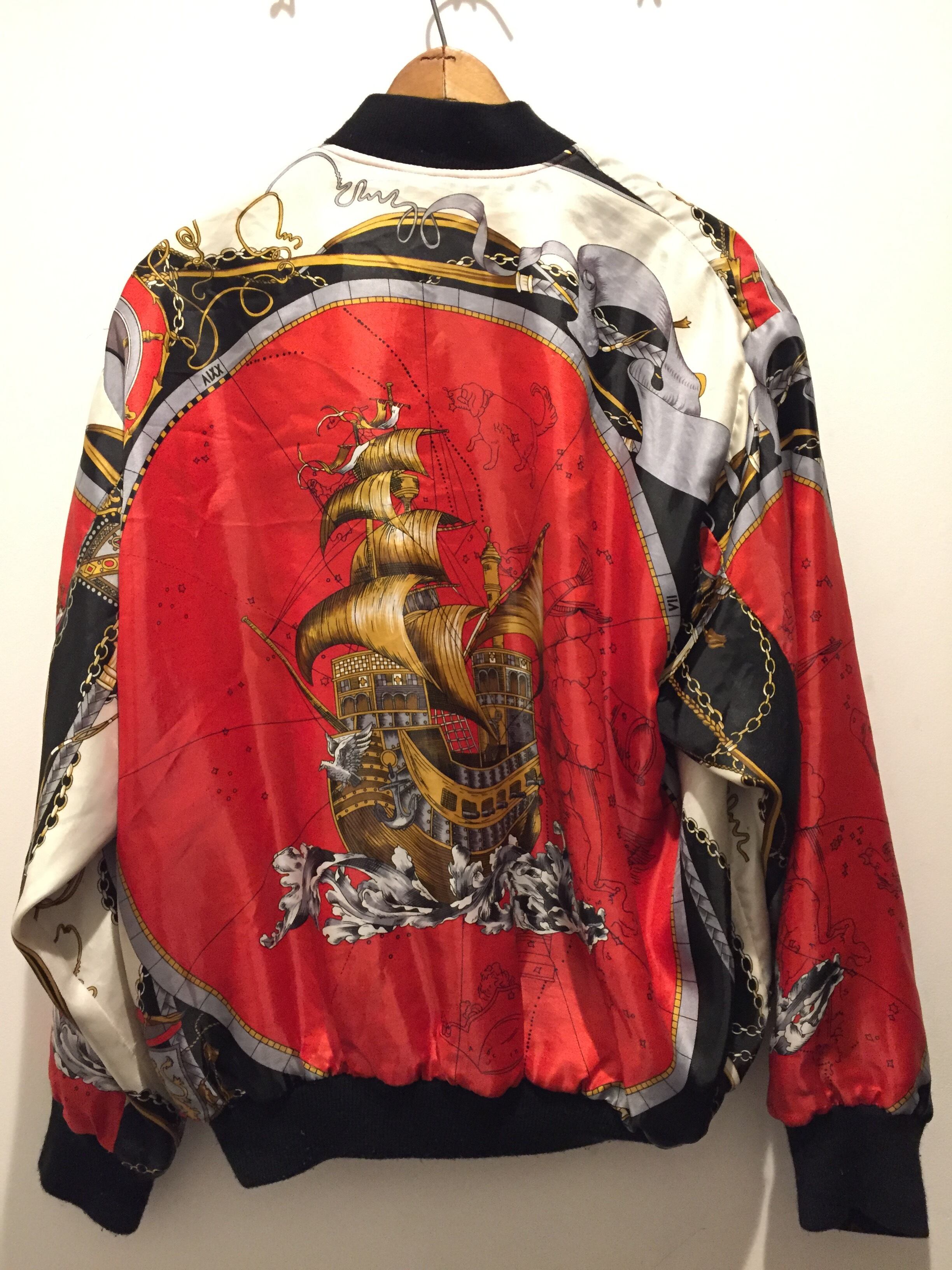 90年代のブートのシャネルの総柄ジャケットをモチーフにしたアイテムとなります。こちらが珍しいのはリバーシブルでどちらも総柄のデザインになっているところです。なかなかリバーシブルは見ませんね。インパクトがあるデザインなので人と被りたくない方には特にオススメです。男女共に着用していただけるアイテムですね。