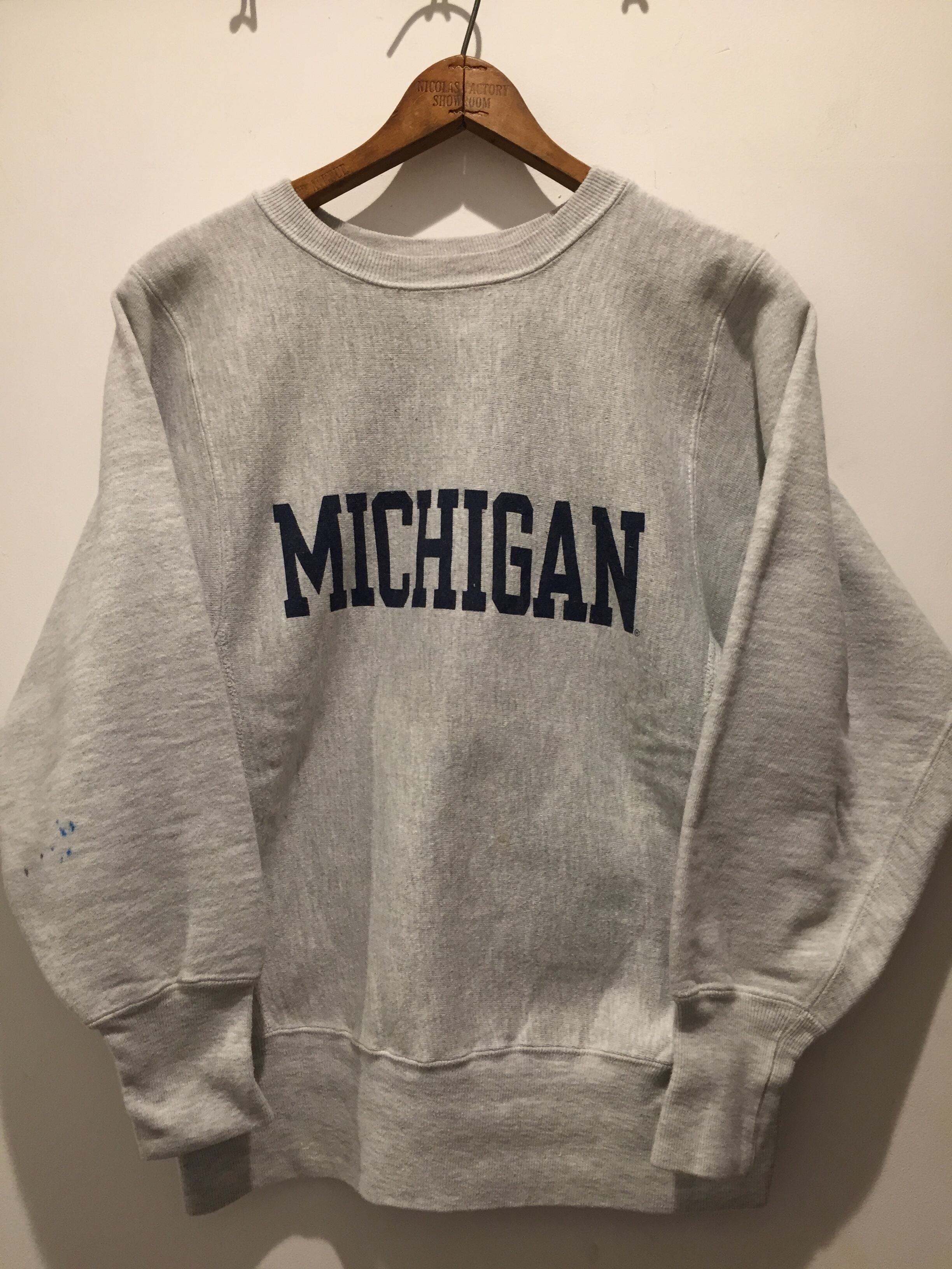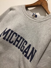 90年代アメリカ製のチャンピオンリバースウィーブです。90年代前半の刺繍タグ付きのアメリカ製チャンピオンです。こちらは定番カラーのグレーでデニムパンツ、ミリタリーパンツ、ブラックデニムどれも相性が良いですね。ネイビーでMICHIGANのロゴがシンプルで良いですね。なかなか無い希少なSサイズで女性の方にもオススメです。アメリカ製のリバースは近年見つからなくなってきているので気になる方は是非。