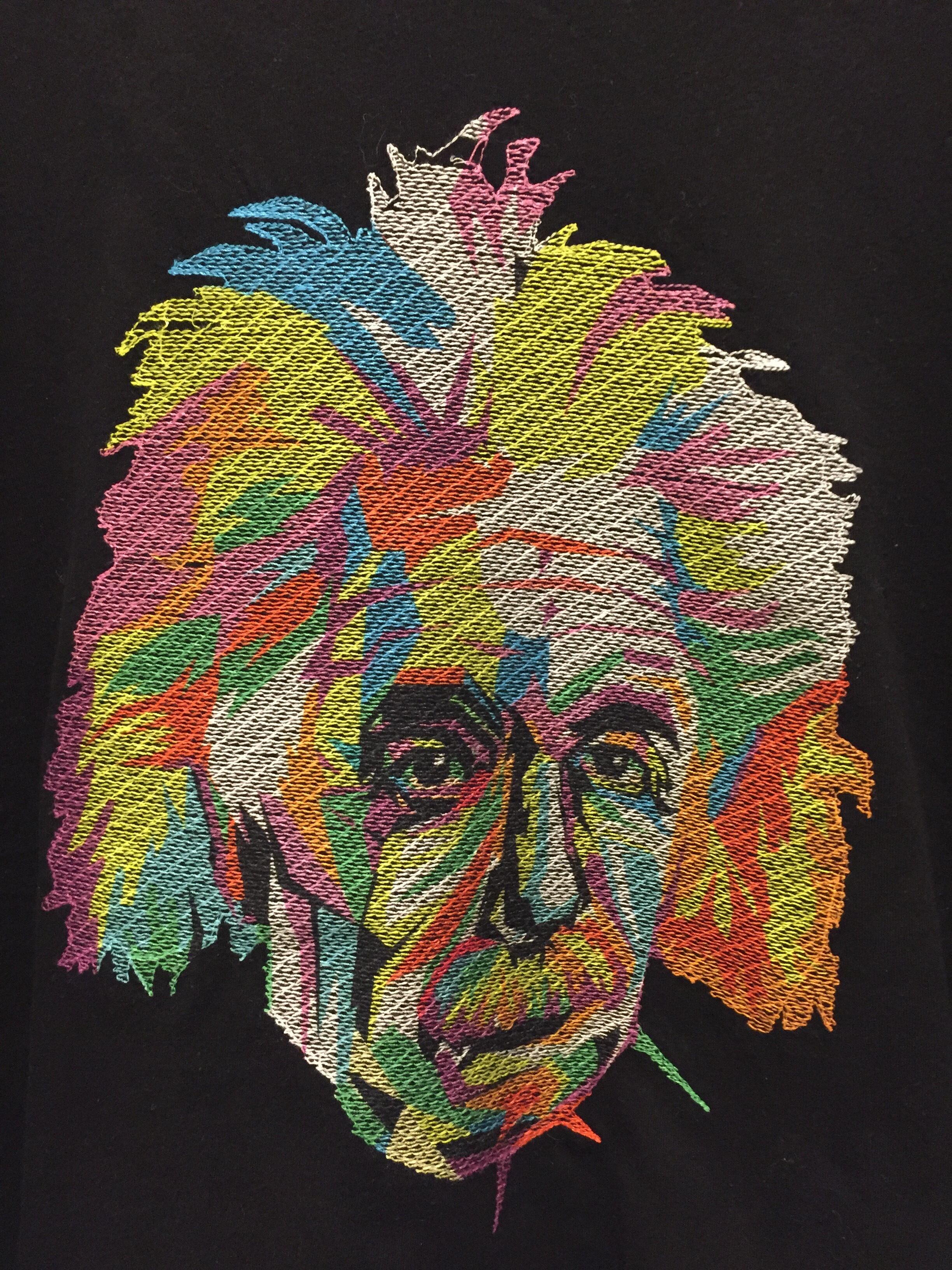 ドイツ生まれの理論物理学者であるアルベルト・アインシュタイン。一般相対性理論やノーベル物理学賞を受賞したりみんなが知っている人物ですね。こちらのTシャツはブラックボディにアインシュタインが多彩な糸で刺繍されているデザインです。近年物ですがシンプルかつインパクトあるデザインですね。