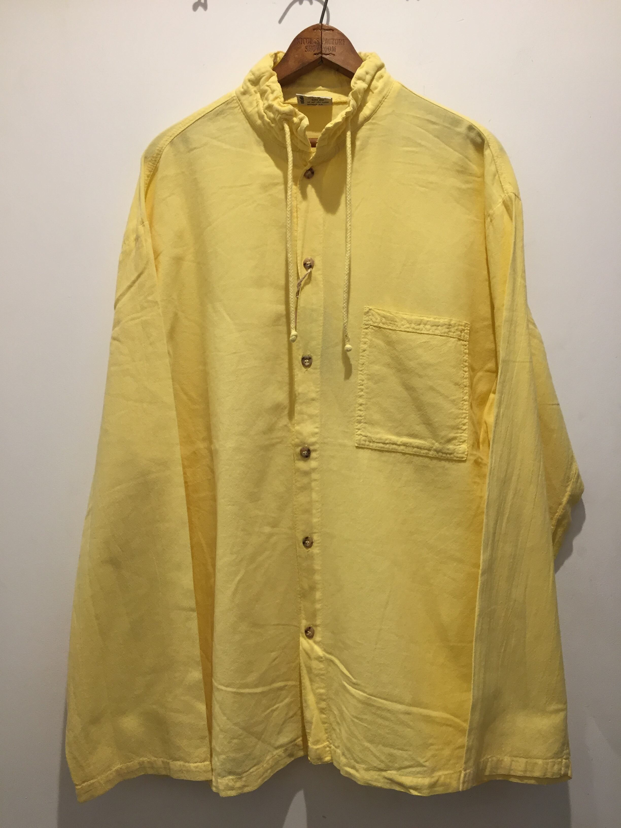 鮮やかなレモンイエローのスモックシャツです。袖にはリブが無く、裾にはスリットが入りシルエットも良い1着です。ボタンを閉めて着用するときはパーカーのフードのように紐を結んでも良いですね。コットン100%でアメリカ製となかなか無いアイテムです。ホワイトのパンツやアイスブルーのデニムとも相性ピッタリですね。