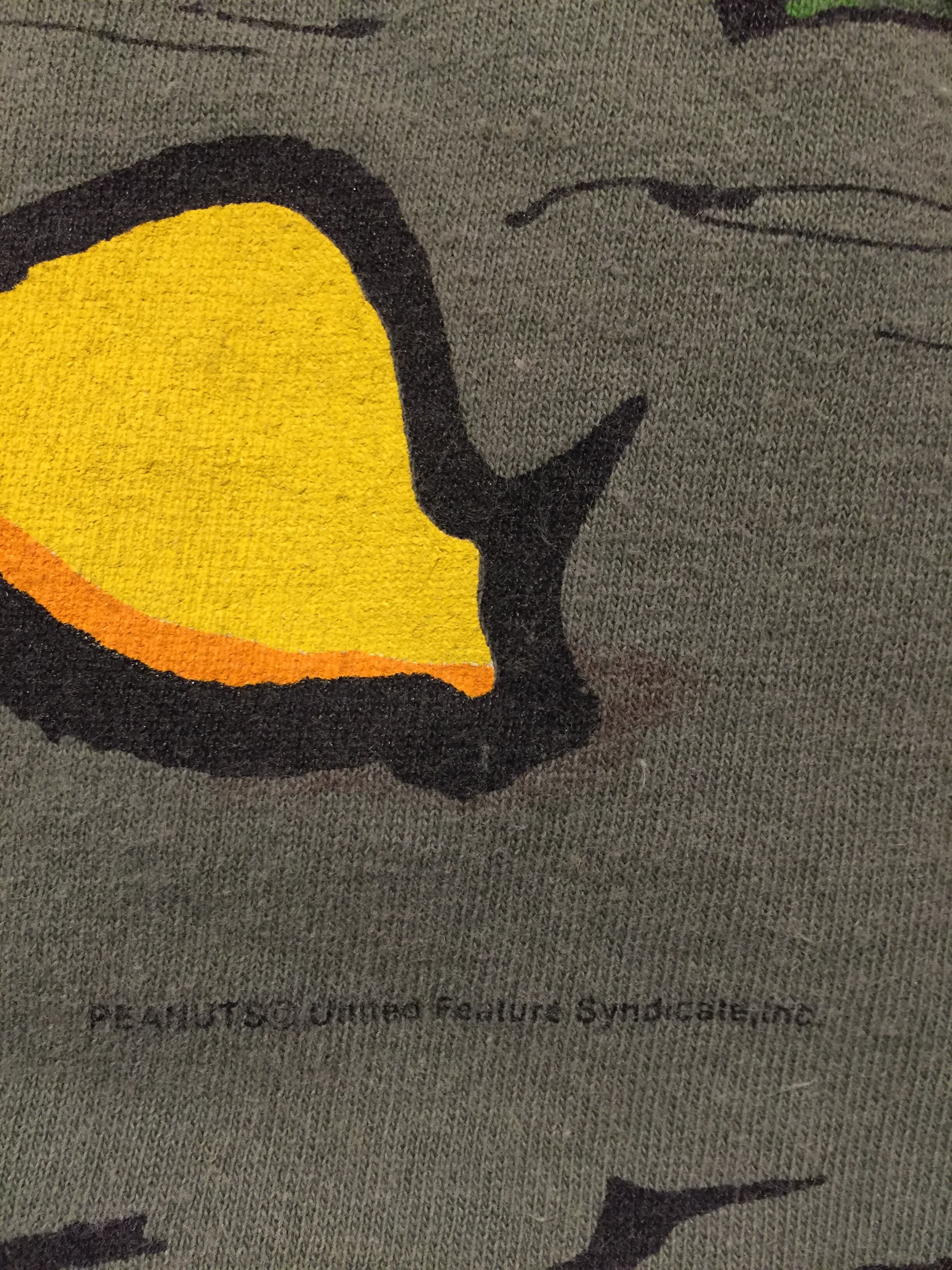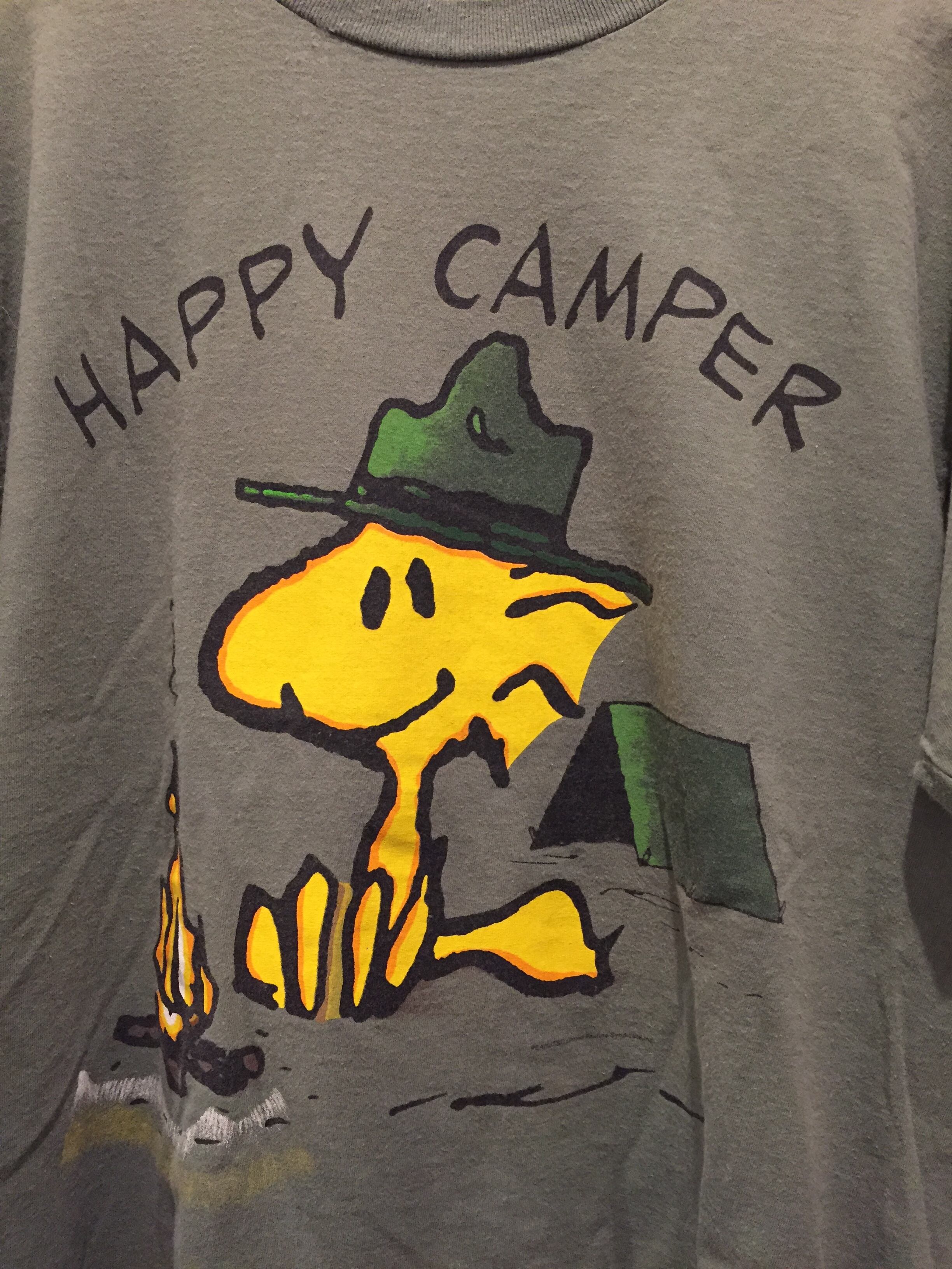 袖がシングルステッチでコットン100%なのでタグは欠損していますがおそらくアメリカ製のボディだと思われます。スヌーピーの大親友であるウッドストックがメインのTシャツです。ウッドストックがキャンプをしているなんとも可愛らしいデザインでバッグプリントもあります。スヌーピーメインのTシャツは見かけますがウッドストック単体のはあまり見ませんね。カーキとボディカラーも良くキャンプ好きな方にもオススメな1枚です。