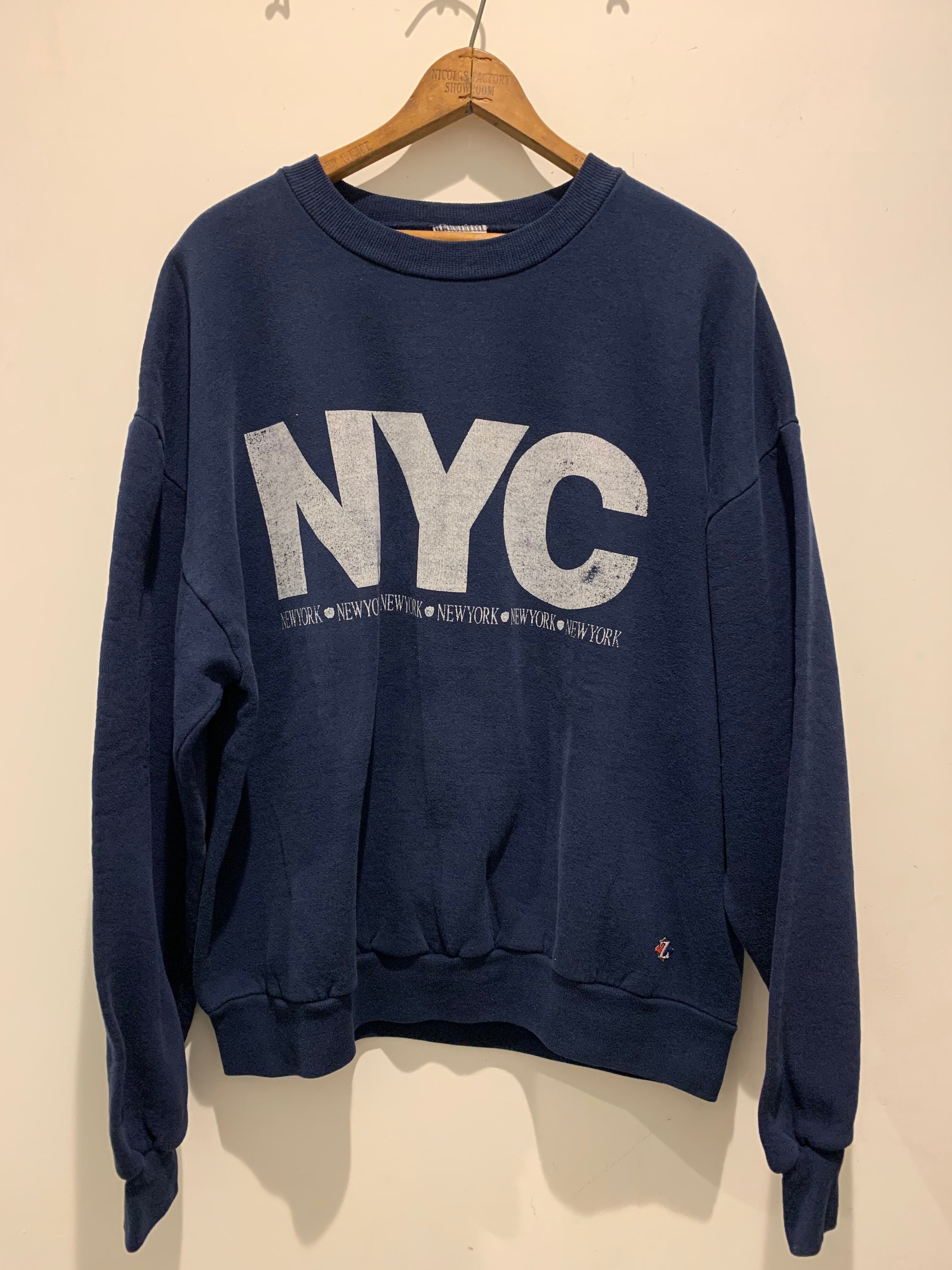 90年代ジャージーズのアメリカ製ボディのスウェットです。カラーはネイビーでフロントのNYCのプリントがカッコイイ1着です。プリントのかすれ具合がまた雰囲気良く良い感じです。身幅が広く丈も長すぎずの90年代らしいシルエットで男女ともにオススメなスウェットです。