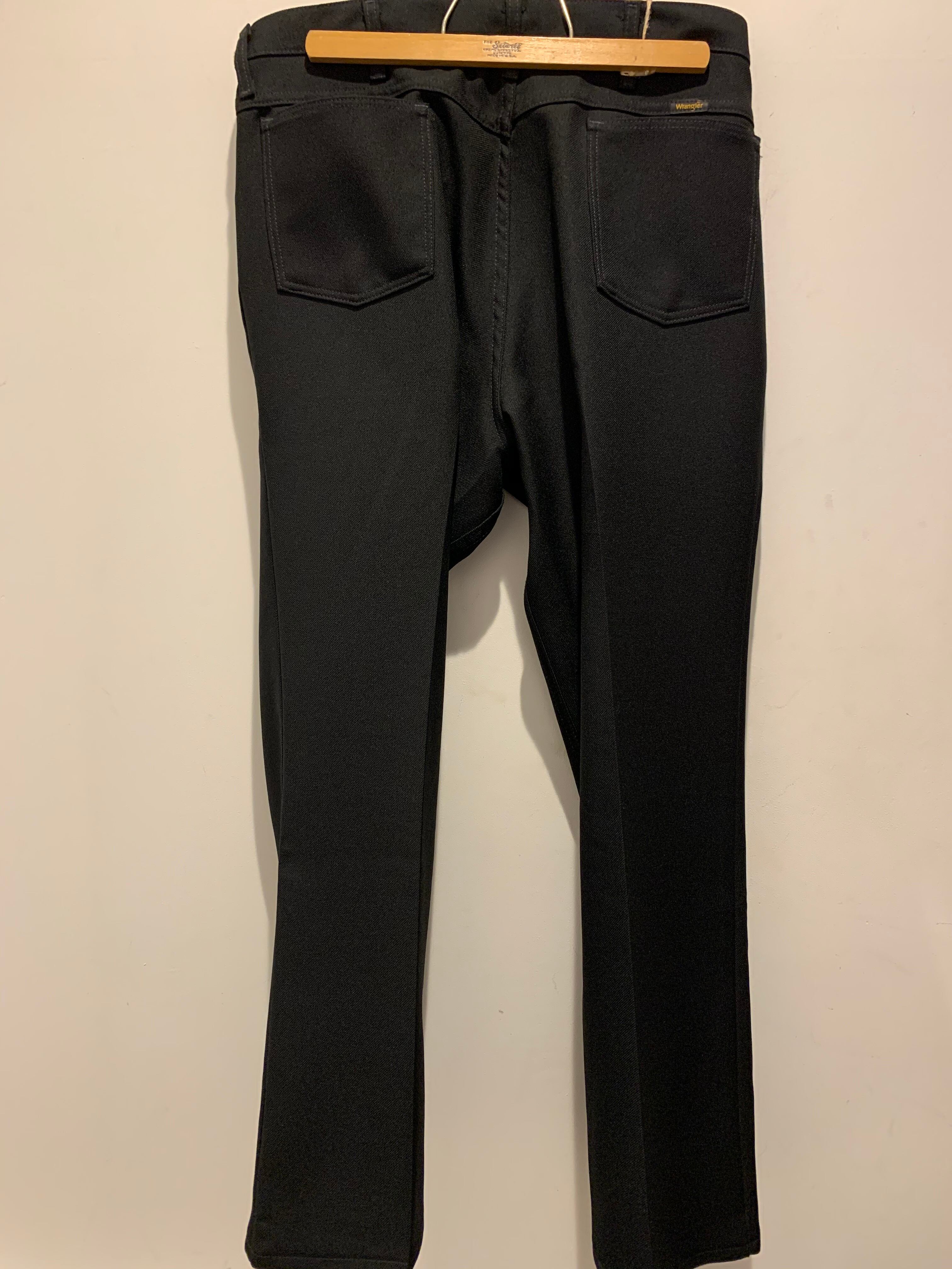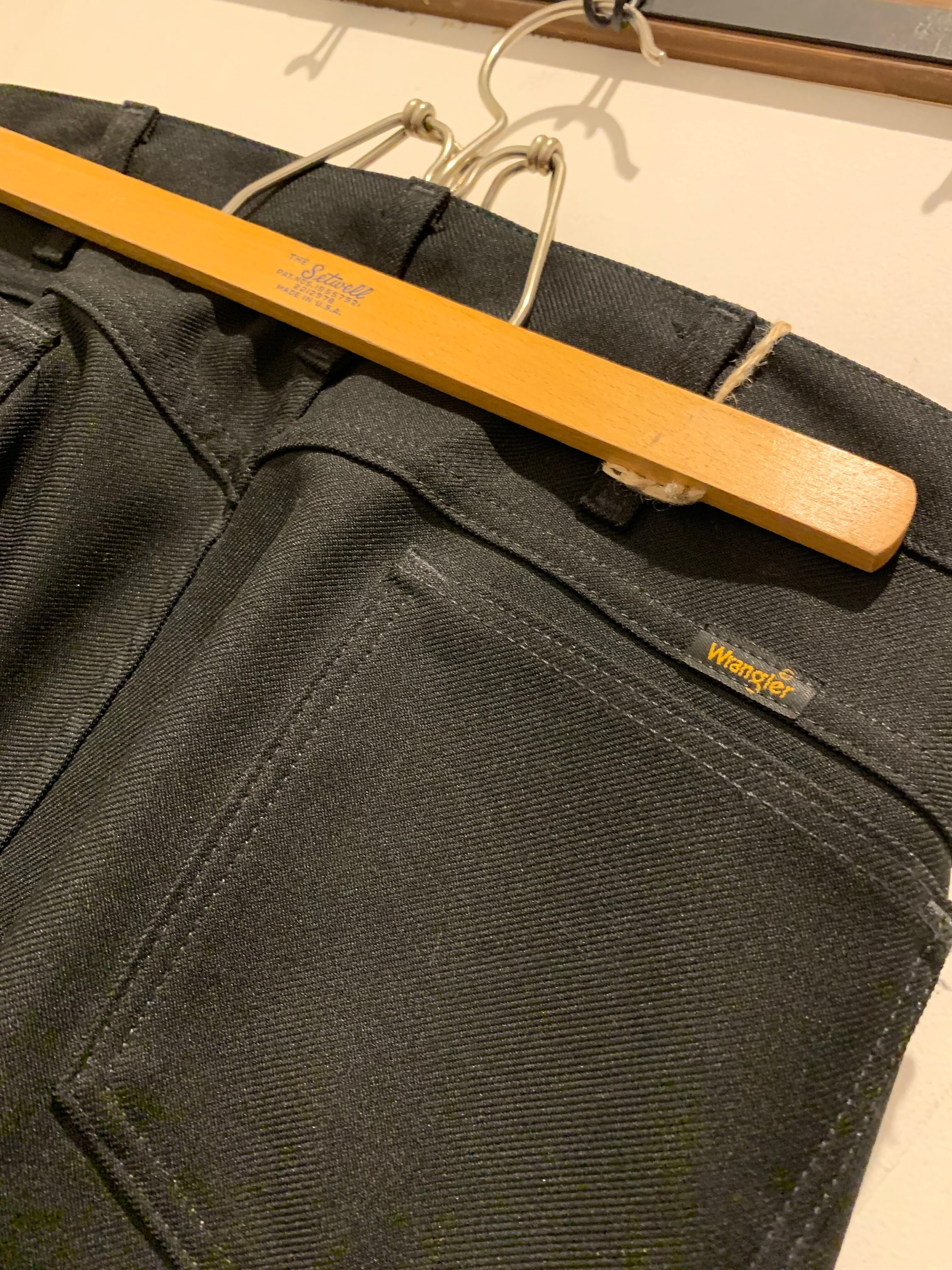 90年代USファブリックのメキシコ製ラングラーで通称ランチャーパンツです。人気もありなかなか出てこないブラックカラーとなります。ランチャーはデニムと違い生地が伸びないので大きめなサイズ感がオススメです。こちらはW38なので結構大きめですがベルトで絞って履いていただくと良い感じです。レングスが30でゆるいブーツカットも旬で良いですね。
