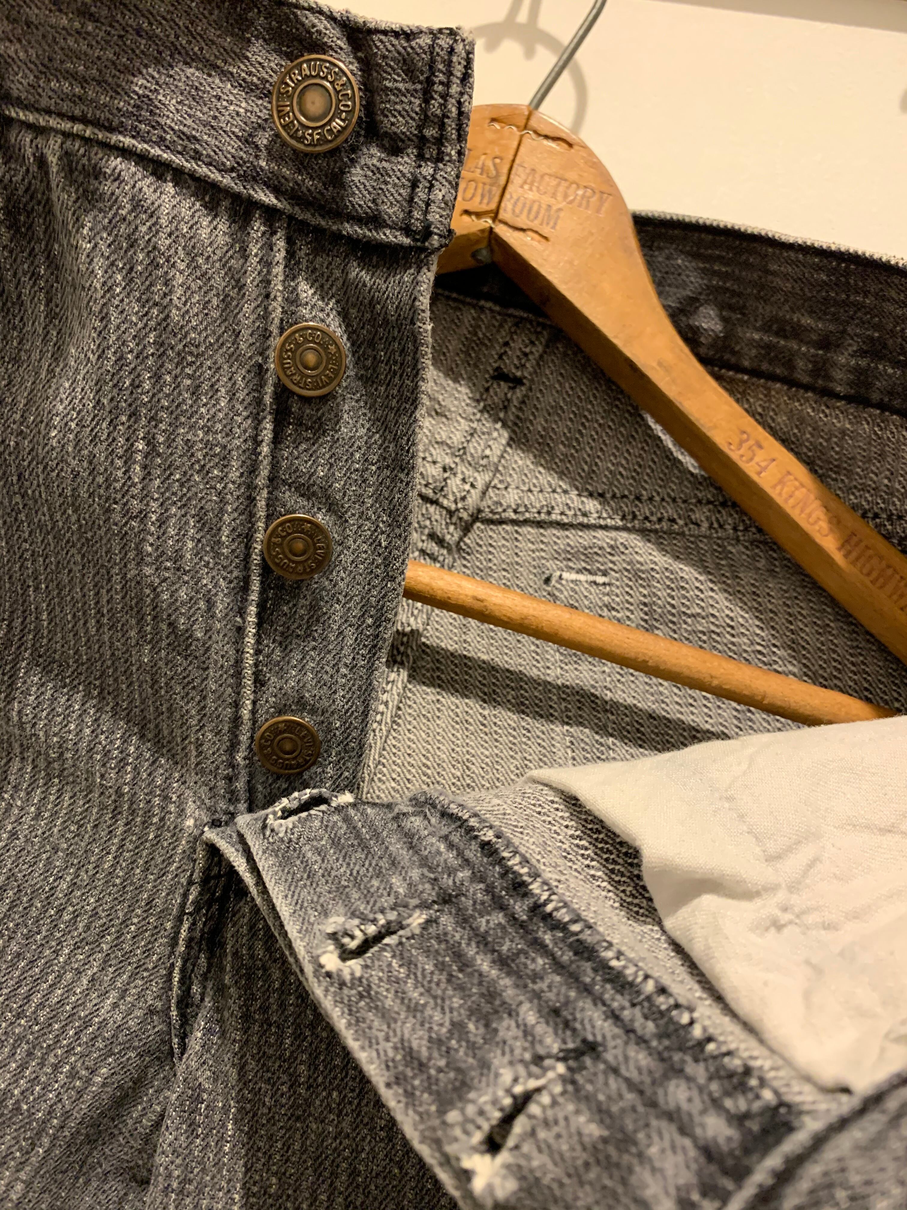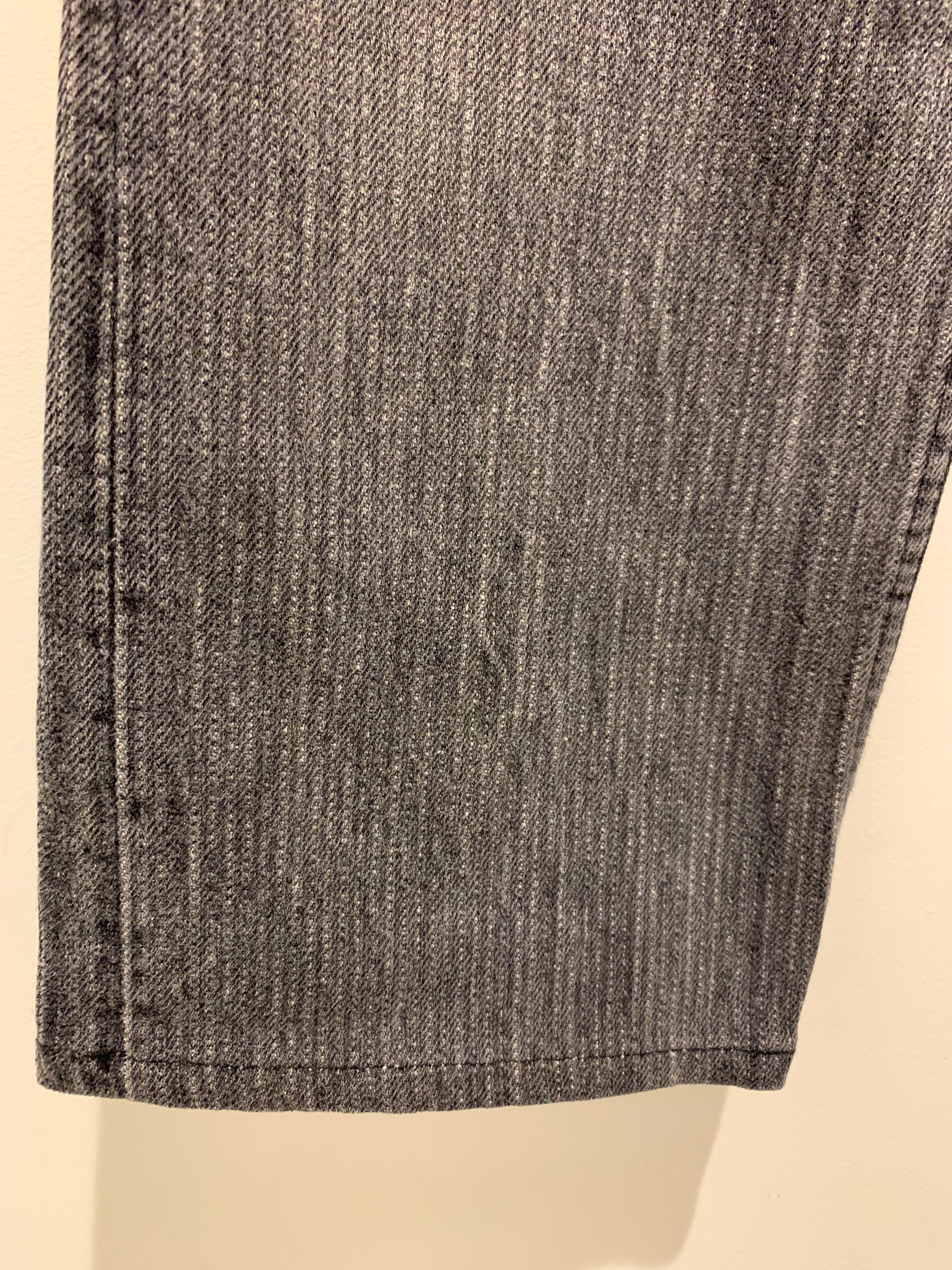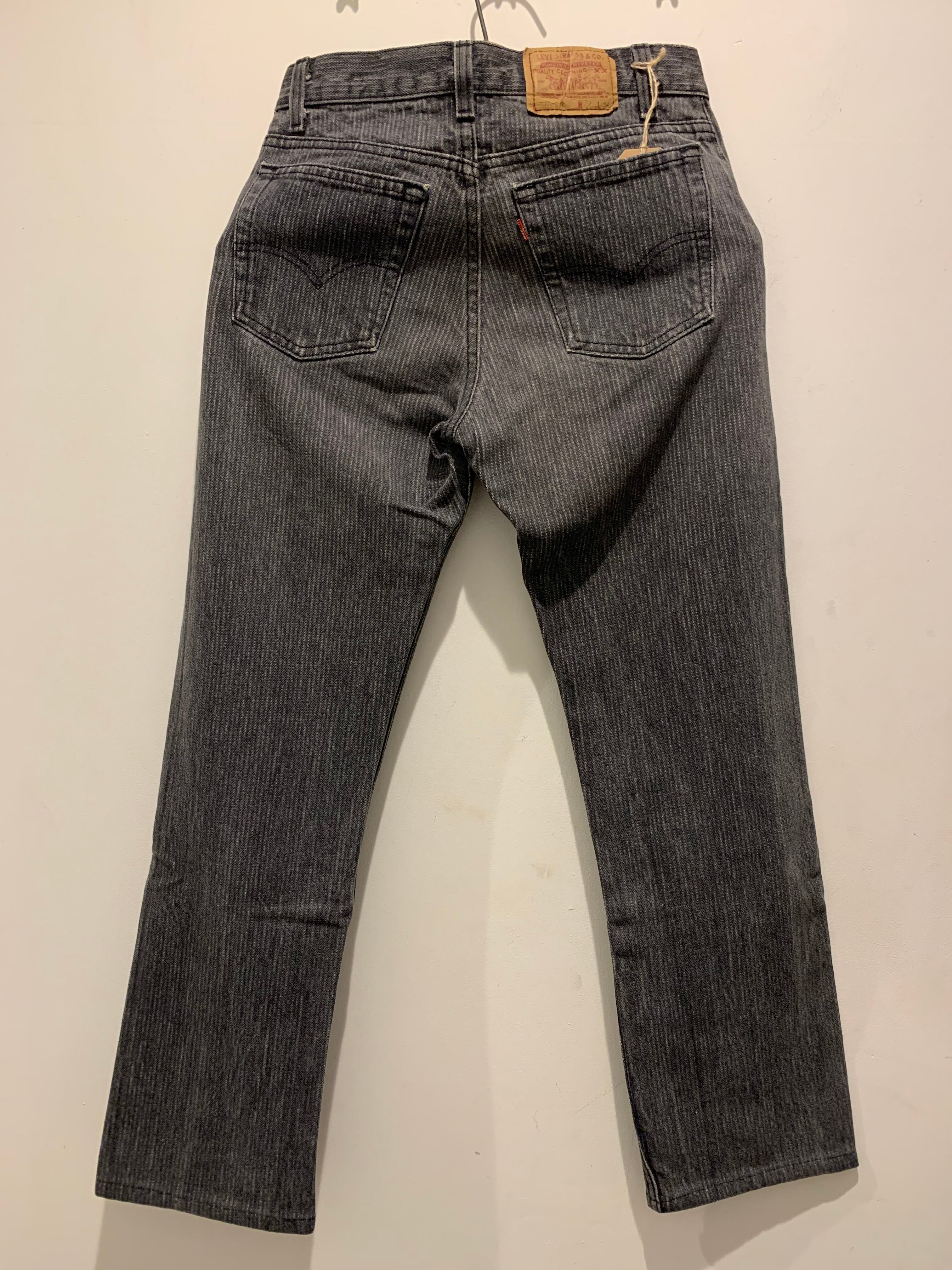 1985年製のブラックデニムパンツです。こちら珍しいのが織り柄がストライプの物で品番は701−0119。501のスチューデントモデルでシルエットはストレートとなります。裾はシングルで裾上げされております。女性の方が履いていたらかっこいいですね。なかなか出てこない希少モデルでサイズ感的にレディースカテゴリにしましたが細身でサイズの合う男性の方にもオススメです。