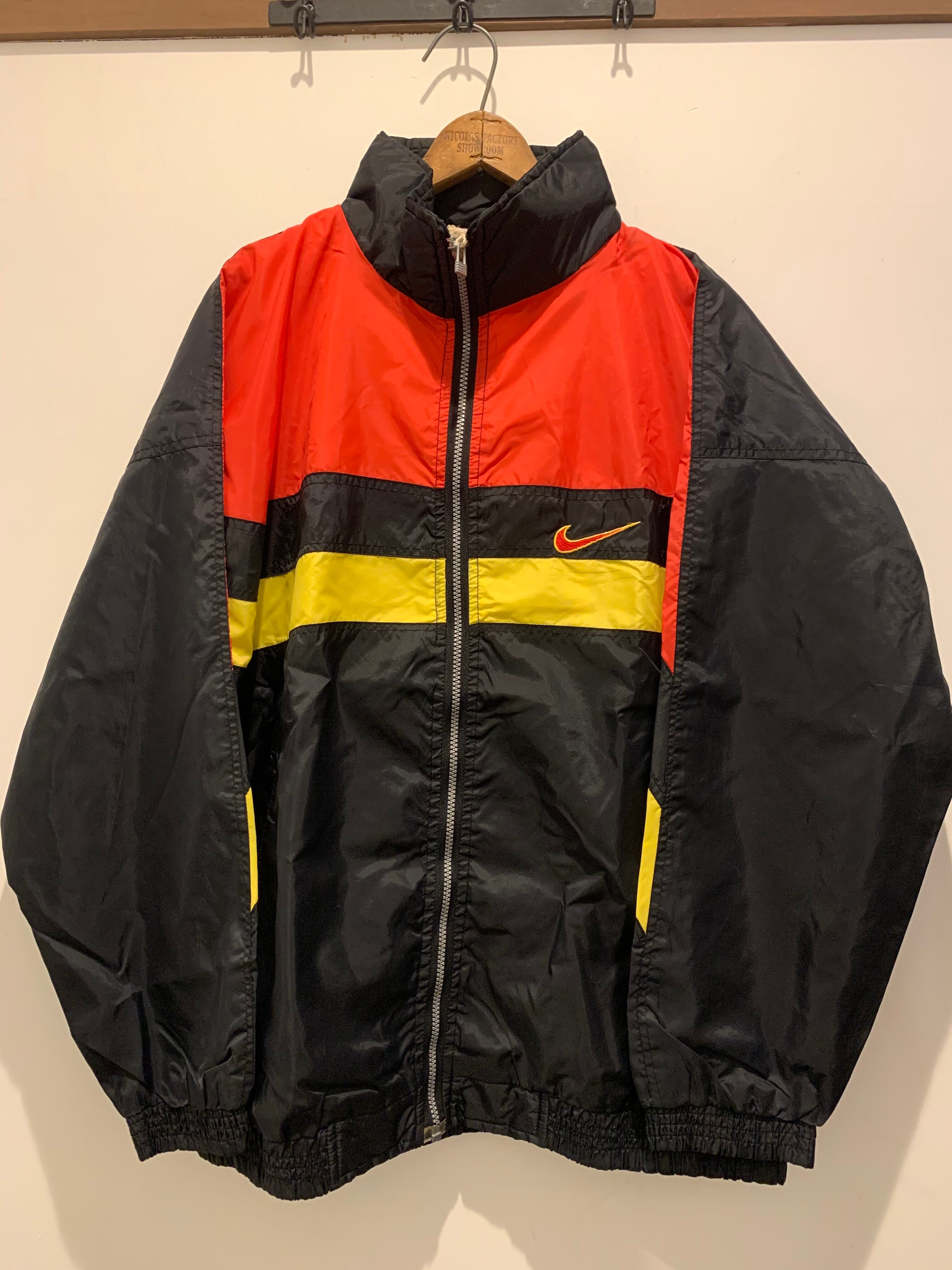90年代シルバータグのアメリカ製のナイキブルゾンです。ブラックベースにフロントから袖にかけてのドイツカラー、バッグにスウォッシュマークとカラーリングとデザインがともに良い1着です。サイズ表記はないですがメンズのL〜XLくらいのゆったりとしたサイズ感で男女ともにオススメな1点です。