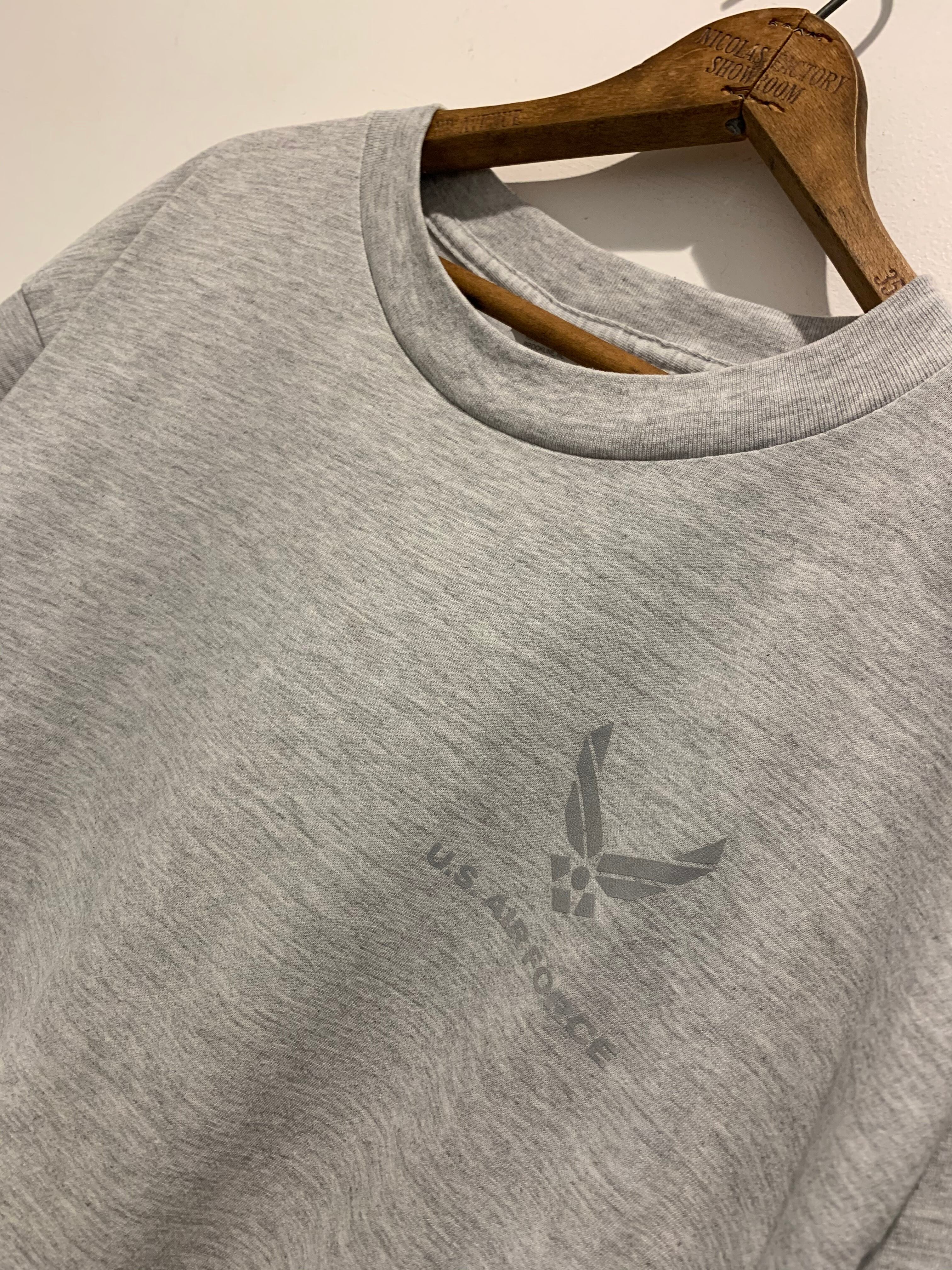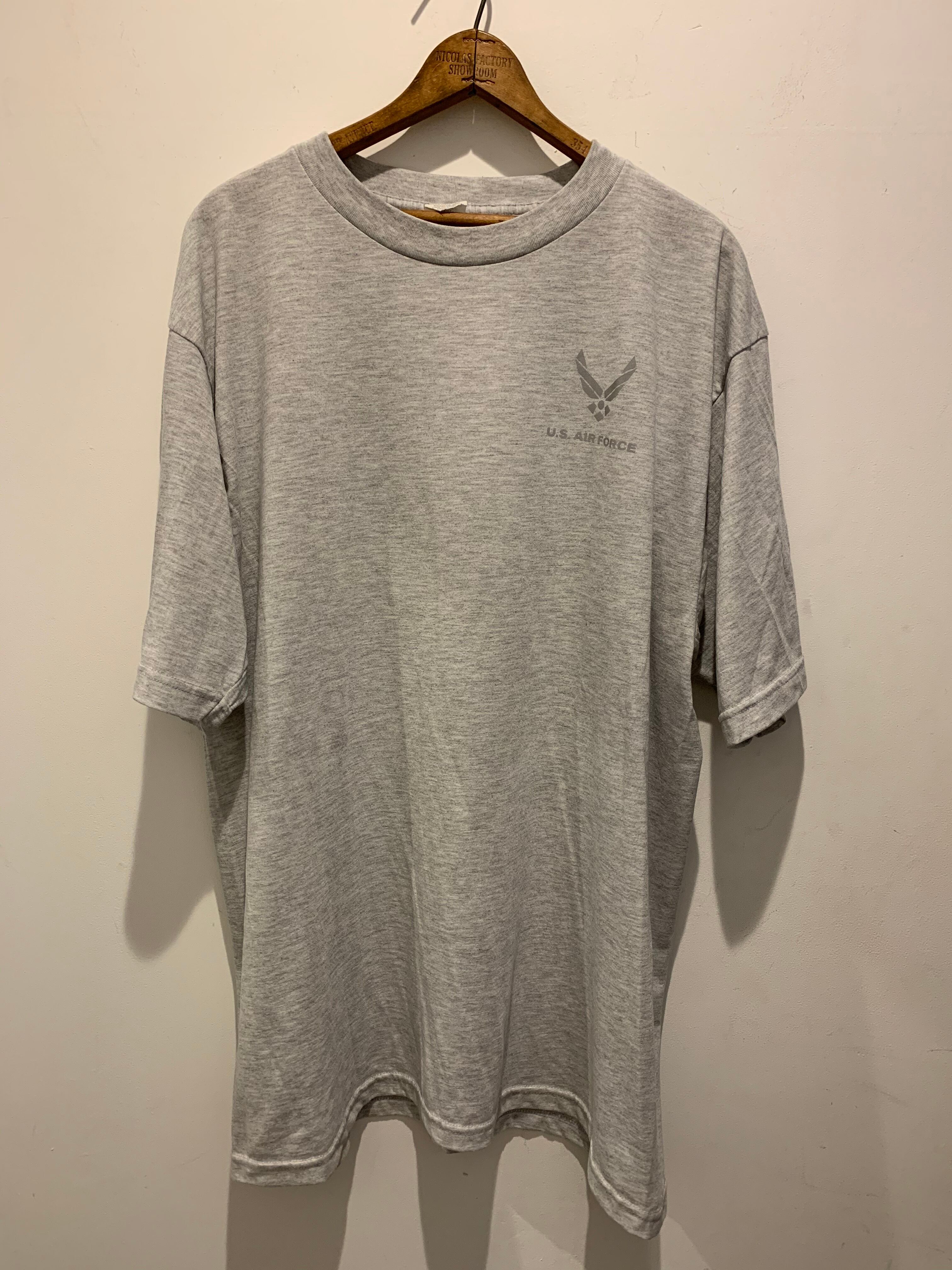2004年製のUSエアフォースのTシャツです。アイボリーカラーの霜降りボディに胸のワンポイントとバッグブリントがございます。プリントはどちらもリフレクターというところもポイントです。ゆったりとしたサイズ感でポリエステル素材で軽くて着やすく速乾性もありオススメです。