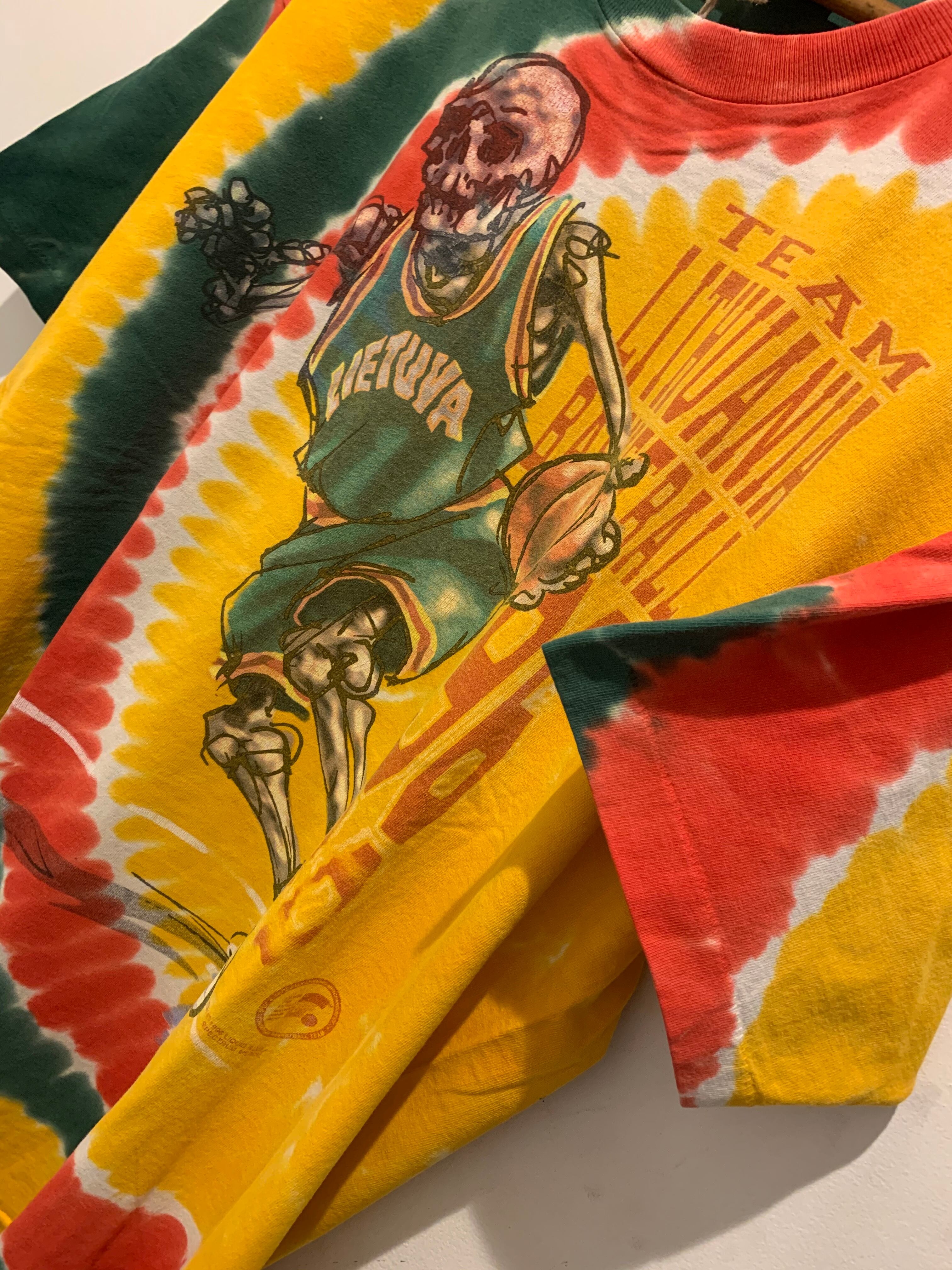 タイダイ染めにスカルのバスケットボールデザインでインパクトのある1着です。またバッグプリントも入っているのもポイントですね。1996年のコピーライト入りでアメリカ製のボディで袖と裾はシングルステッチとなります。重ね着などでインナーに差し色として使うのもまた良いですね。