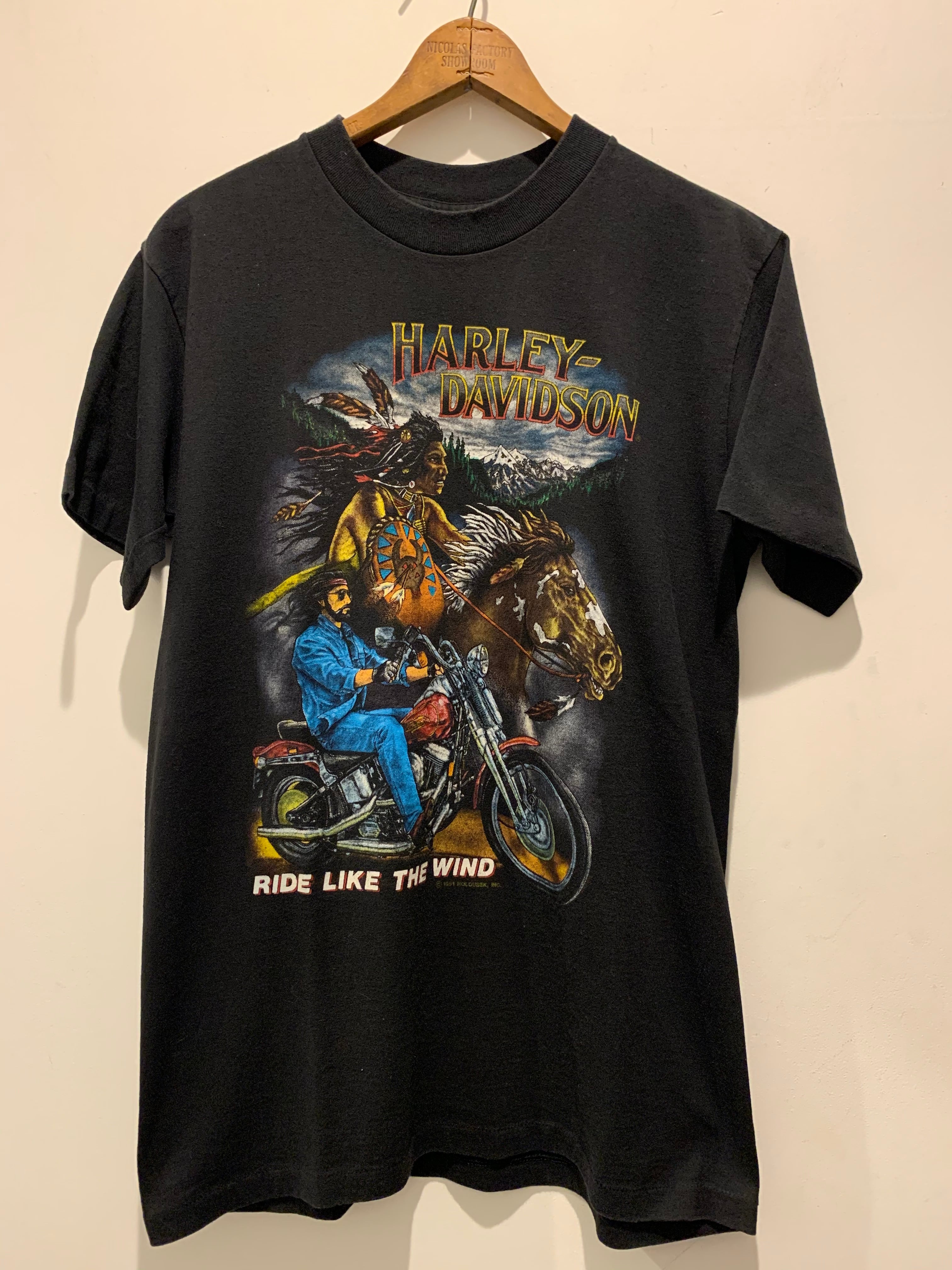 90年代のアメリカ製ハーレーTシャツです。コピーライトは1991年で袖、裾ともにシングルステッチとなります。フロントにはバイカーとインディアンが一緒に走っているプリントが珍しくかっこいいデザインです。バッグプリントもあるので1着で存在感ありますね。ほぼデッドストックに近くとても綺麗なコンディションで女性の方にもオススメです。