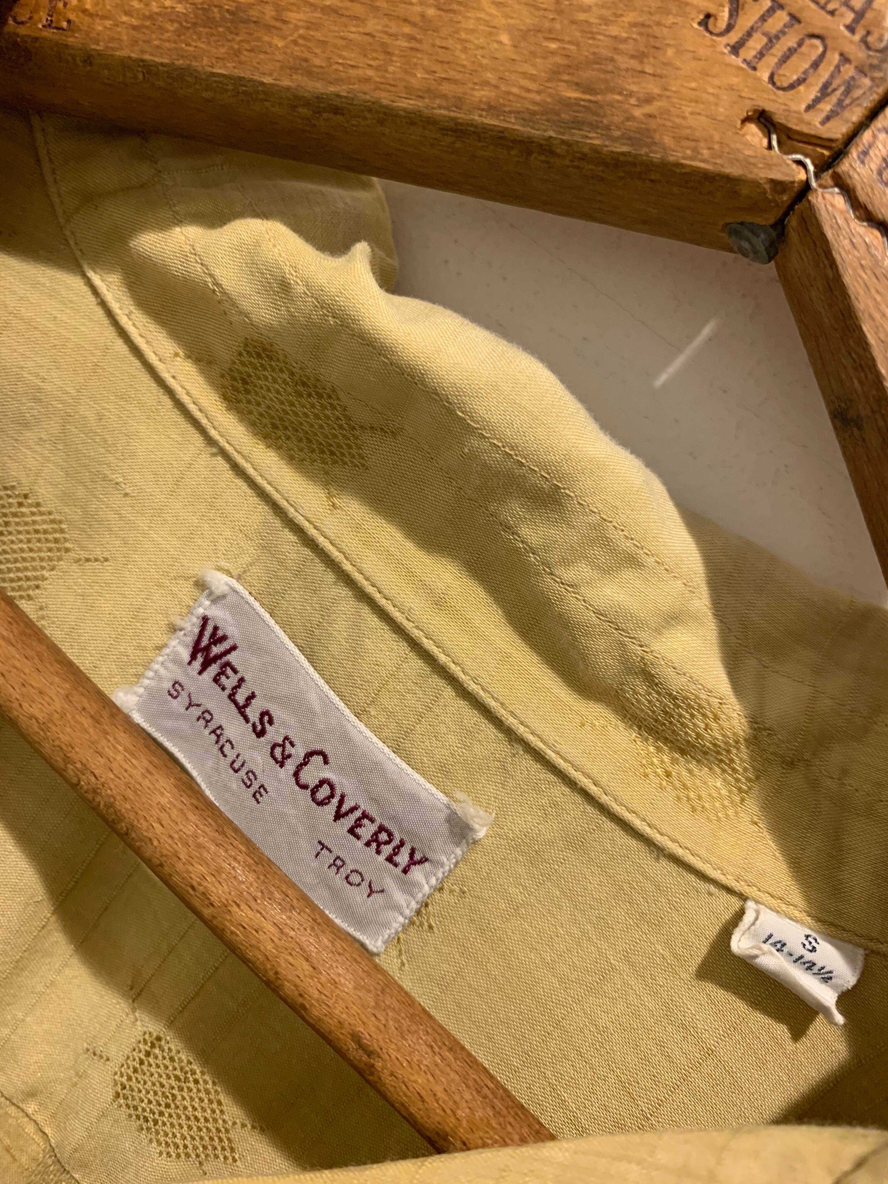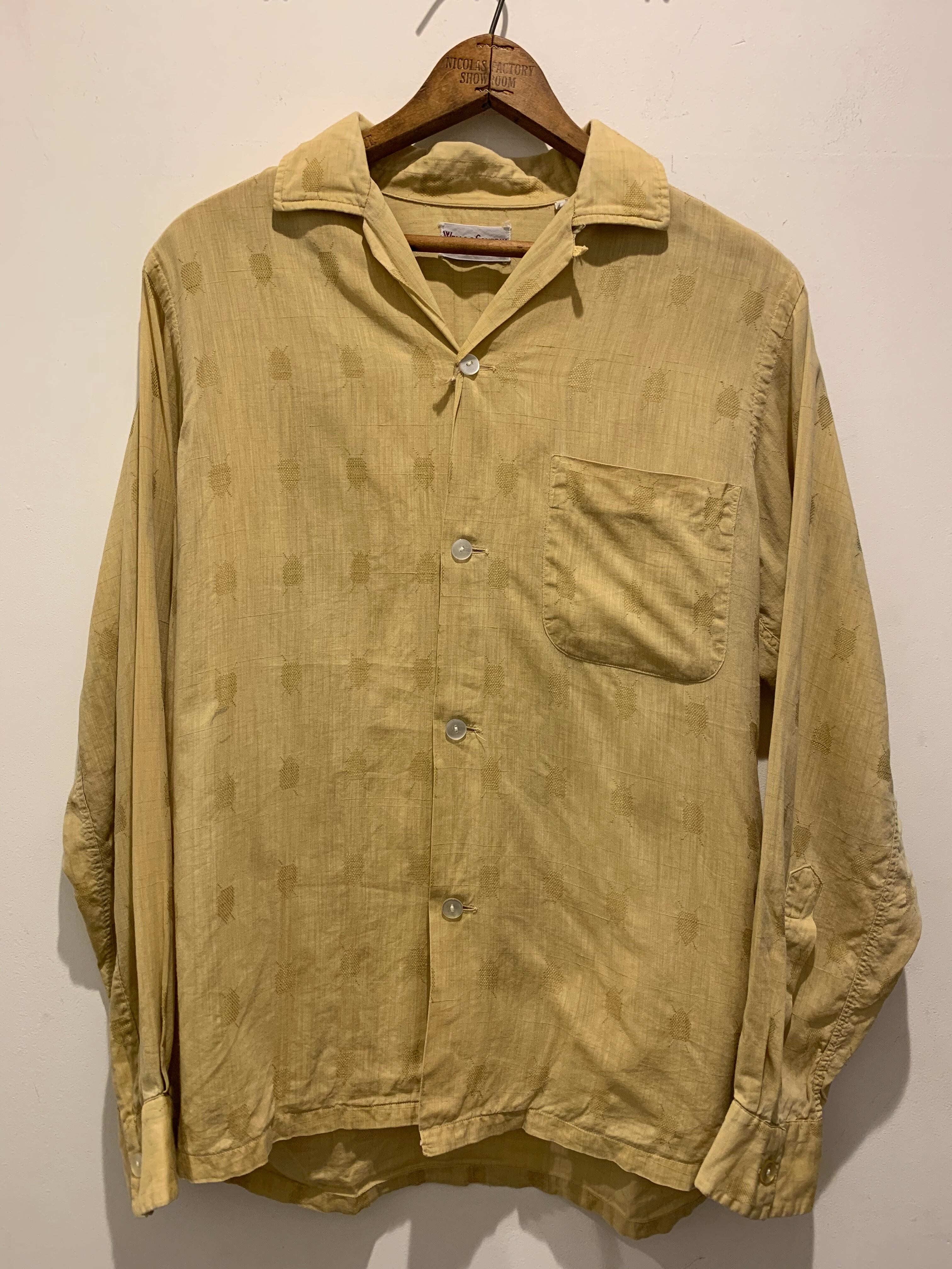 60年代のビンテージコットンシャツです。カラーはベージュで刺繍の総柄でカスリのような感じになっています。一番上はループ仕様で開襟となっています。色味とさりげないデザインがとても良く希少なSサイズで女性の方が着用してもお洒落ですね。