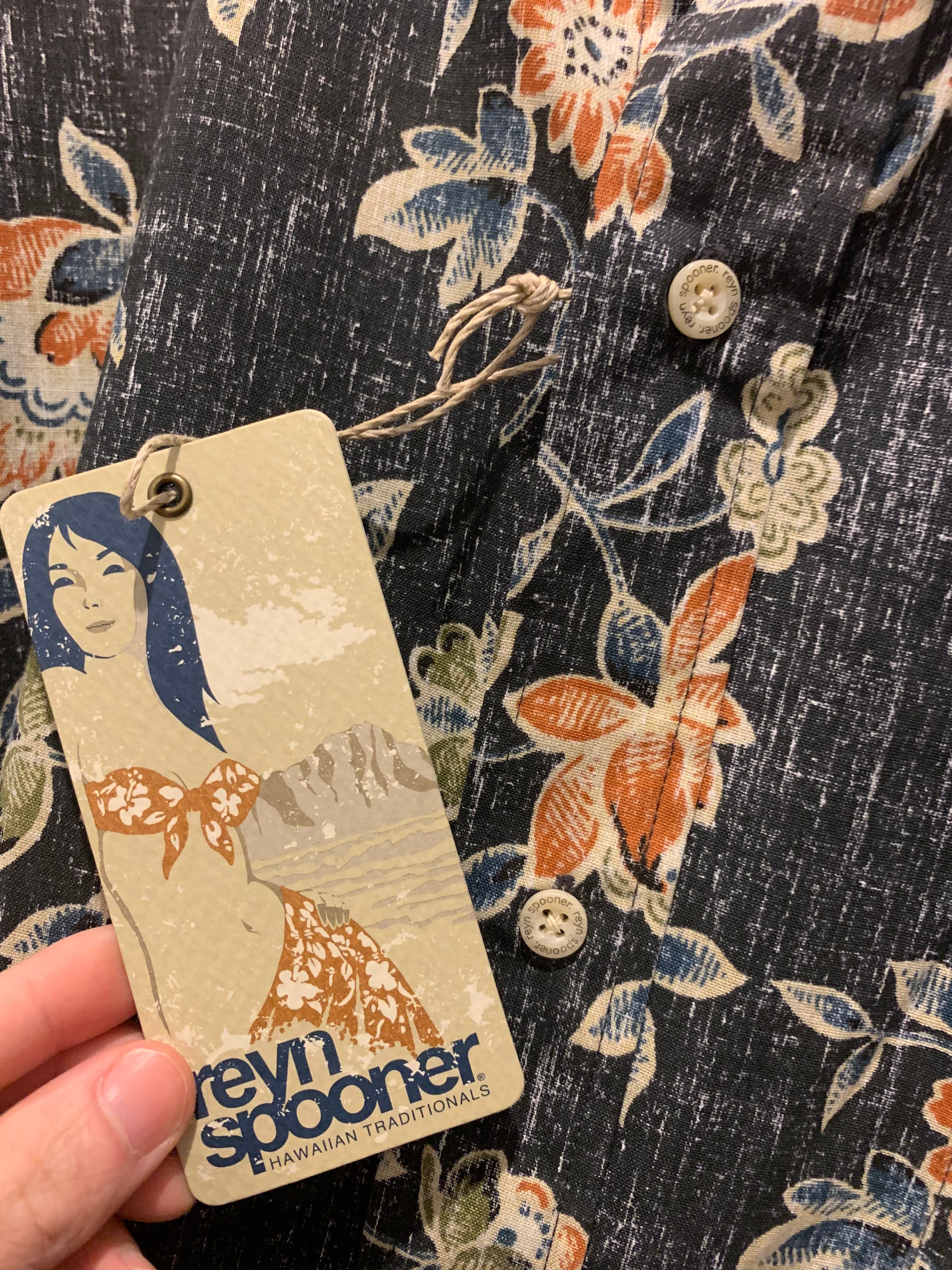 90年代終わって2000年代初頭のレインスプーナーのアロハシャツです。ブラックベースでカッコ良く3点留めで裾にスリットが入ります。裏地をあえて表地にするのもレインスプーナーのシャツは多いですね。ボタンにもロゴが入り、替えのボタン、フラッシャーも付くデッドストック商品でコンディションも良くオススメです。