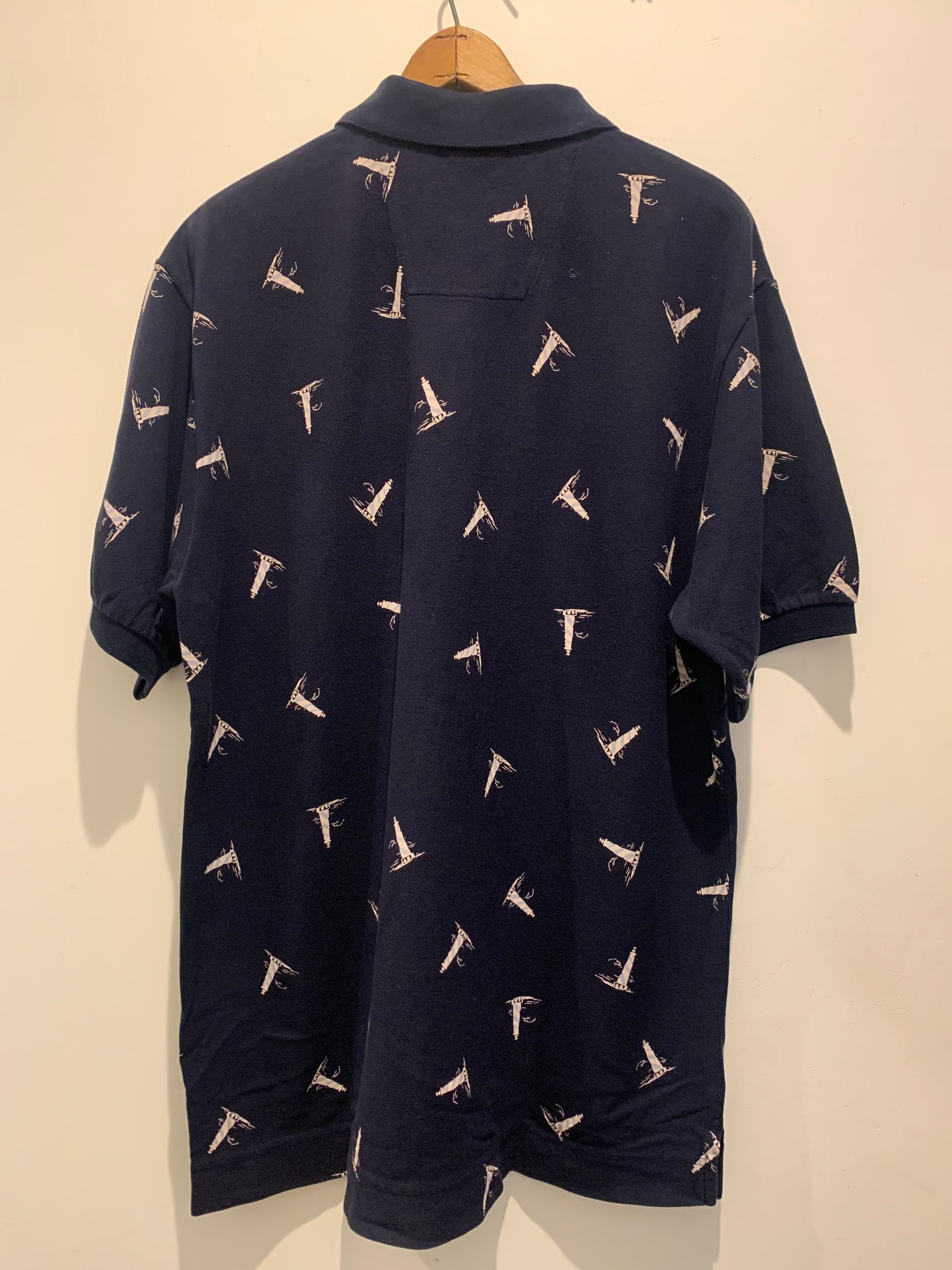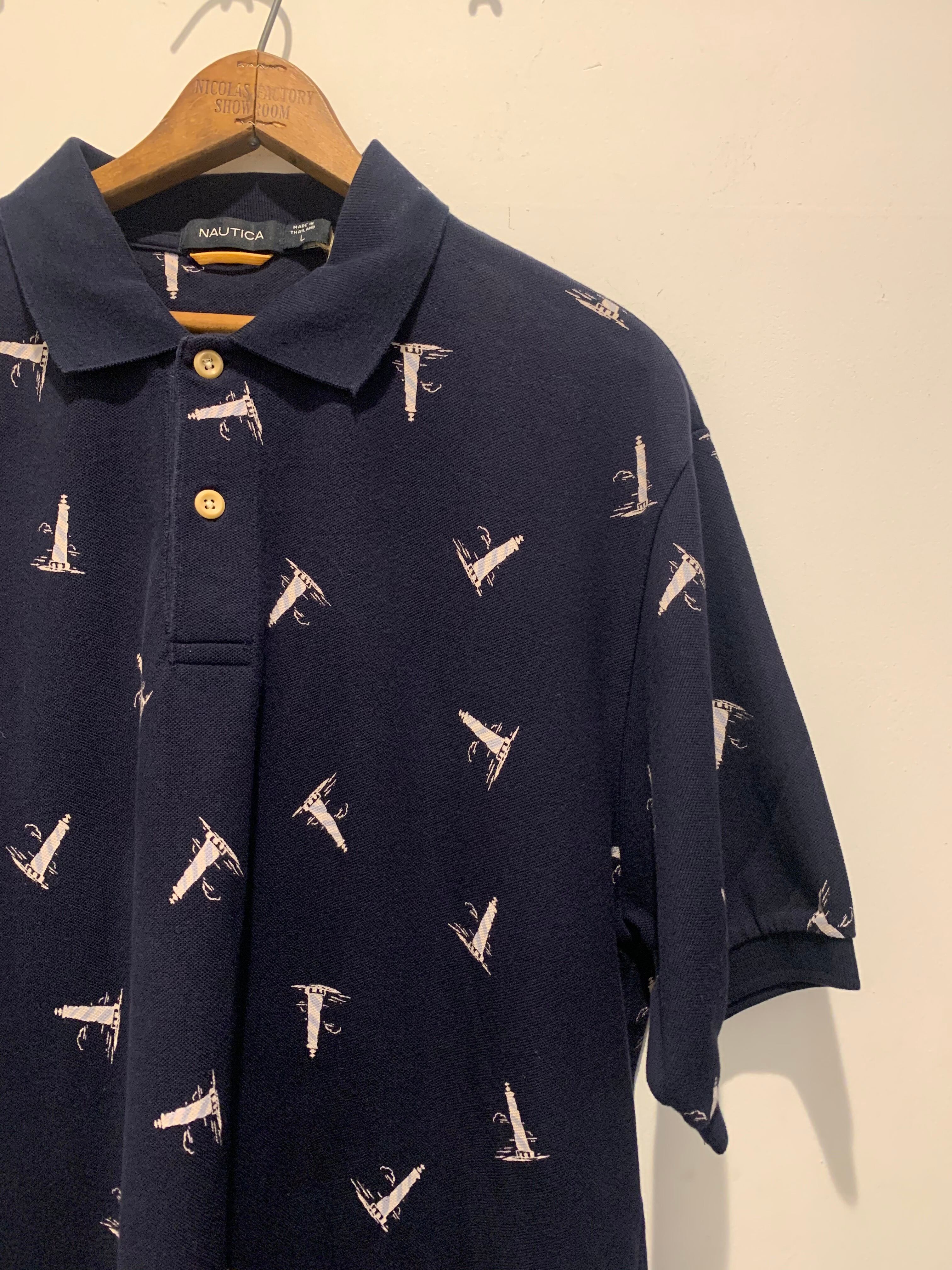 90年代ノーティカのポロシャツです。カラーはネイビーで灯台プリントの総柄となります。ミシガンラグの物とはまた雰囲気が変わりますね。総柄にはなりますが派手な感じは無く合わせやすい1着です。鹿の子素材で裾にスリットが入るのも良いですね。女性の方がゆったりと着用するのもオススメです。