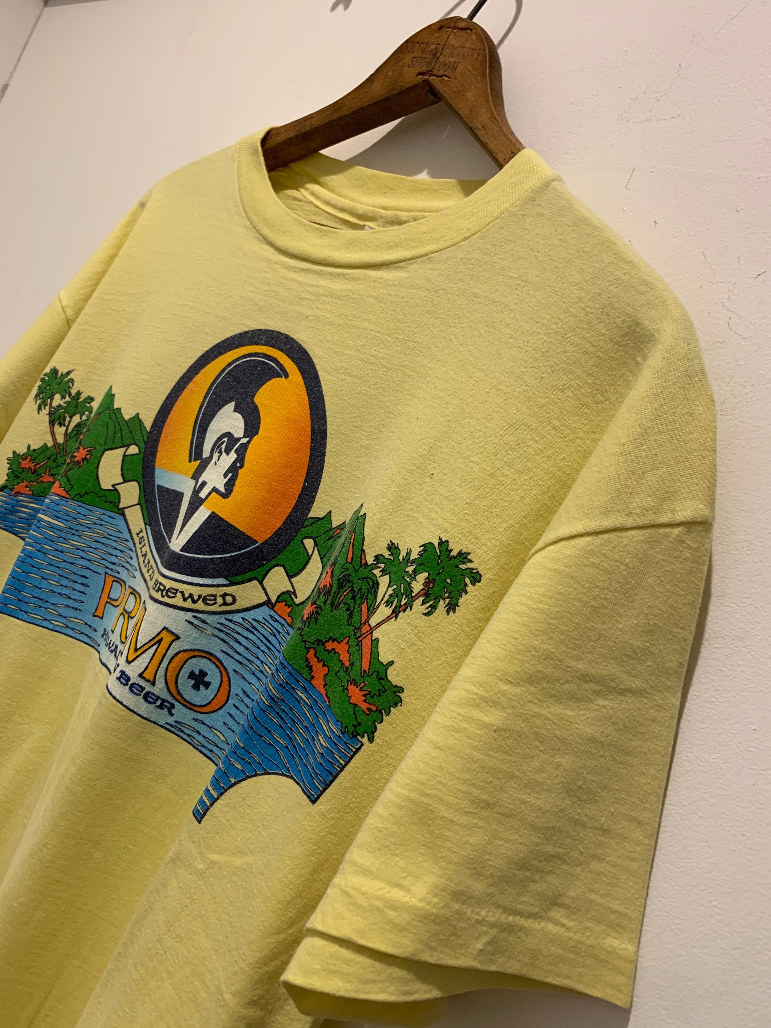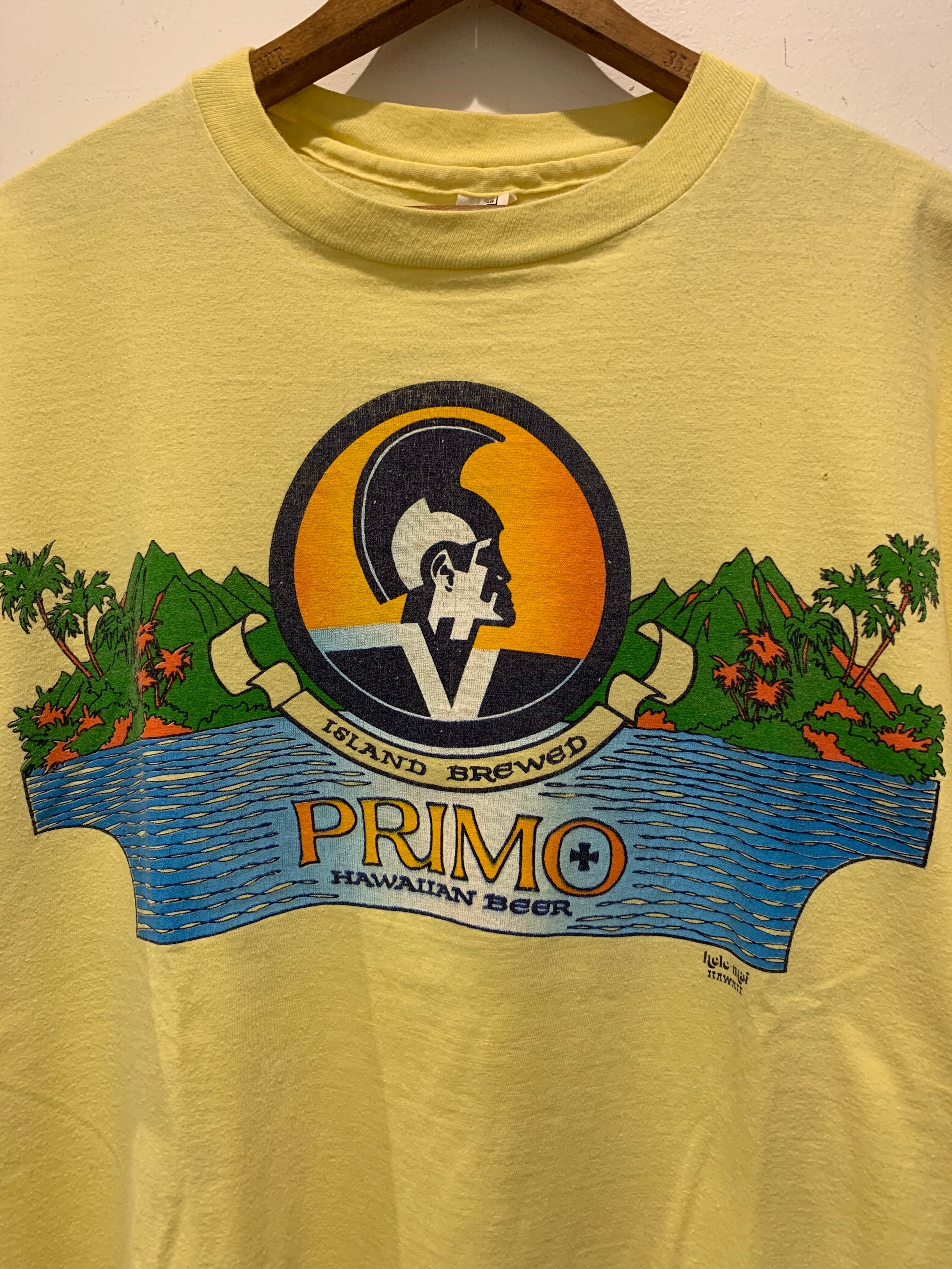 70年代ヘインズボディのプリモTシャツです。プリモといえば1897年から100年間程ハワイで最も愛されたビールで2000年に製造中止されてしまいましたが2010年に日本で復活したビールメーカーとなります。イエローボディにプリモビールのプリントがシンプルにかっこいい1着です。アロハシャツなどのインナーにも良いですね。袖、裾共にシングルステッチです。男女問わずオススメなTシャツです。