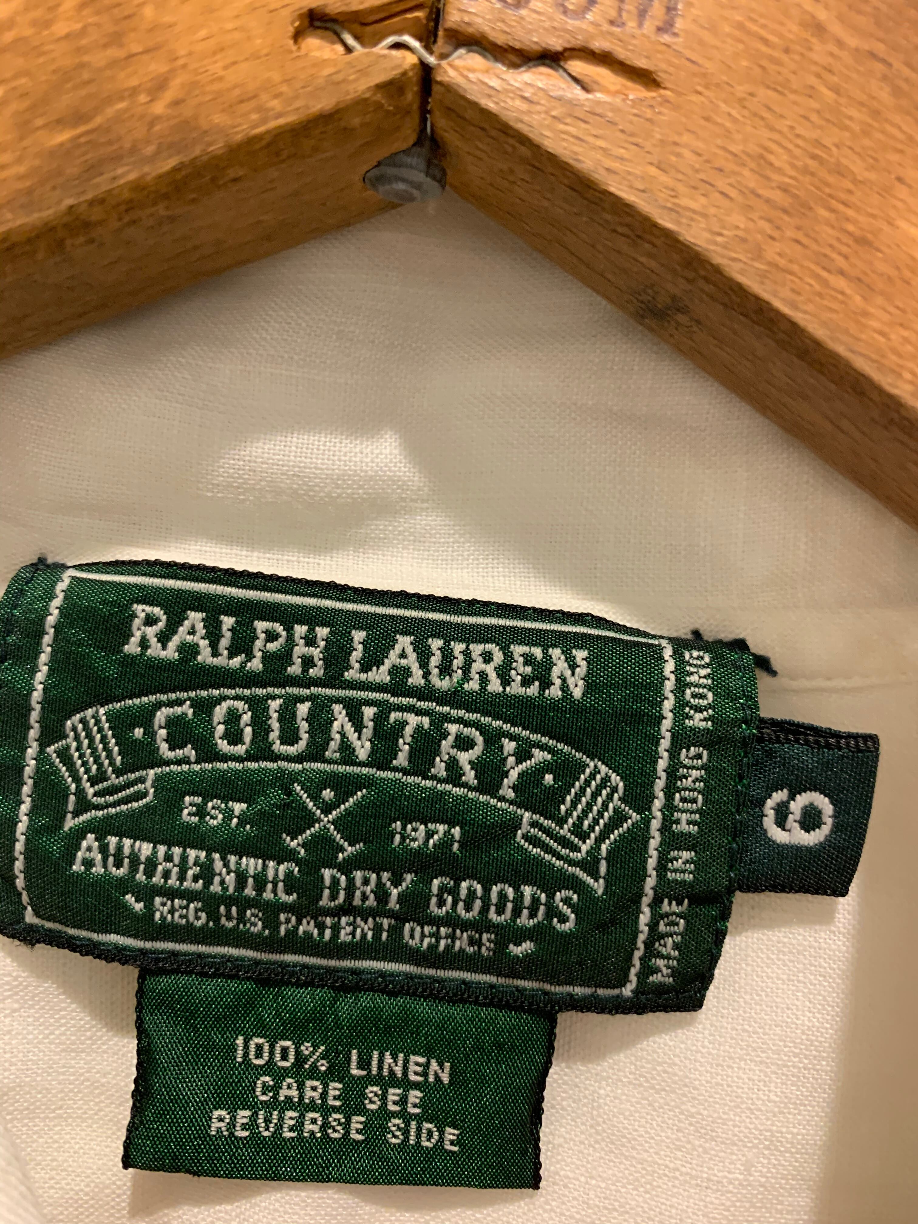 ポロカントリーのリネン半袖シャツです。ポロカントリー(通称ポロカン)は1989年〜1992年の僅か3年のみの生産で1993年からvintageラインのRRLになりましたね。なのでコアなファンも多いポロカントリーです。こちらはレディースのシャツで白リネンに胸元のポケットの刺繍がアクセントになりシンプルですがお洒落な1着です。コンディションも良く身幅ゆったりなシルエットで着用しやすくオススメです。