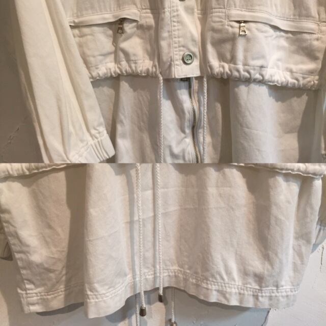 古着で探すとなかなか良いコンディションで見つからないホワイトアイテムです。スタンド襟でコットン100%です。お腹付近までボタン使用でそこからジッパーに切り替わる独特なデザインです。アルミボタンを使用しドローコードの先は鉄を使用したりと細かいところも凝っています。レディース合わせですがダーツも入っていないのでメンズの方でも問題なく着用できます。こういった変わったデザインは古着ならではで他の人と被らないですね。