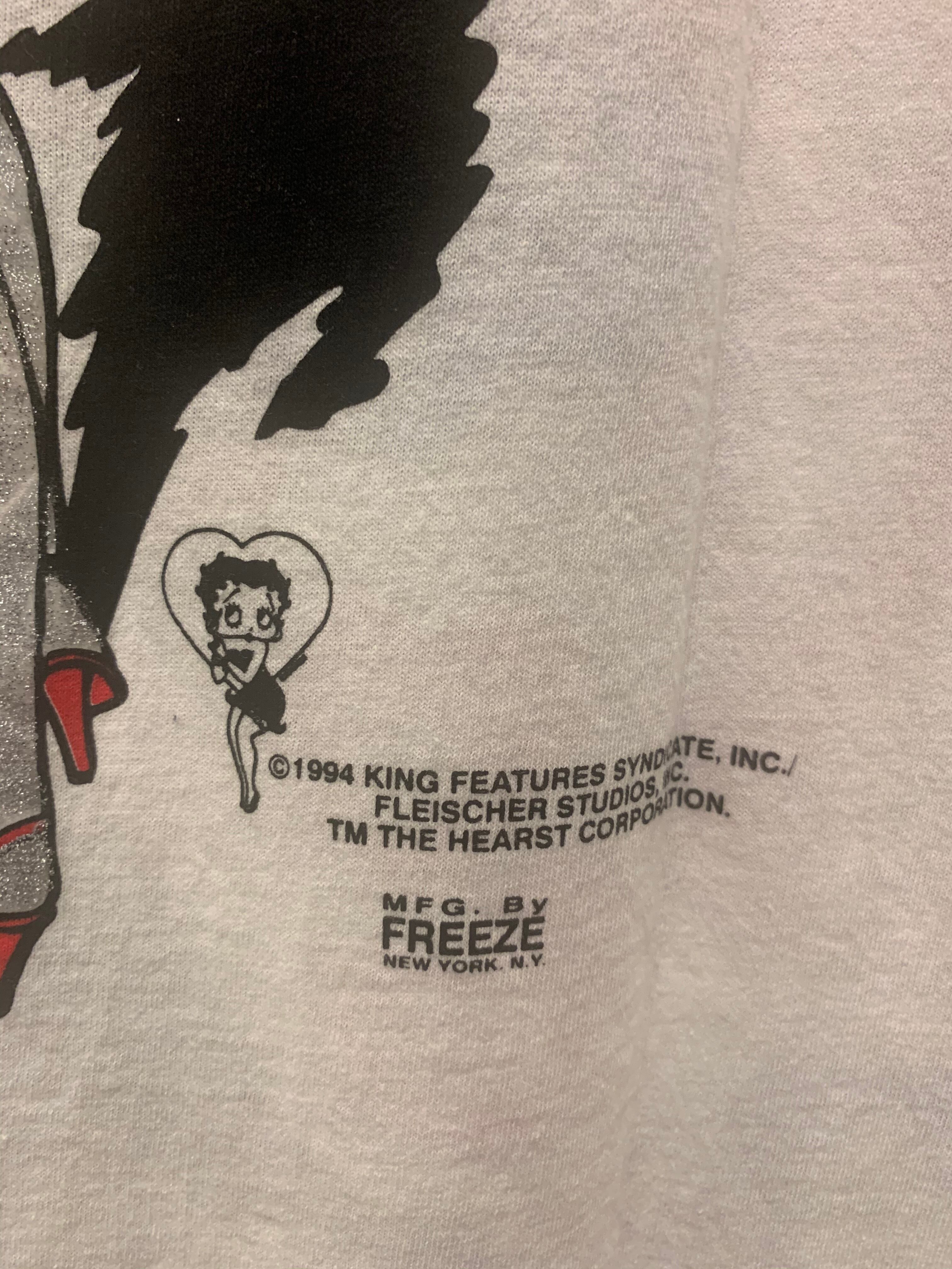 90年代のベティちゃんTシャツです。白ボディにフロントは袖まで全面にデザインされていてロゴなどにはラメなども使用していて豪華な感じとなっています。またバッグプリントもあるので1枚で着用してもバッチリです。1994年のコピーライト付きで袖、裾はダブルステッチとなります。コンディションも良くオススメです。