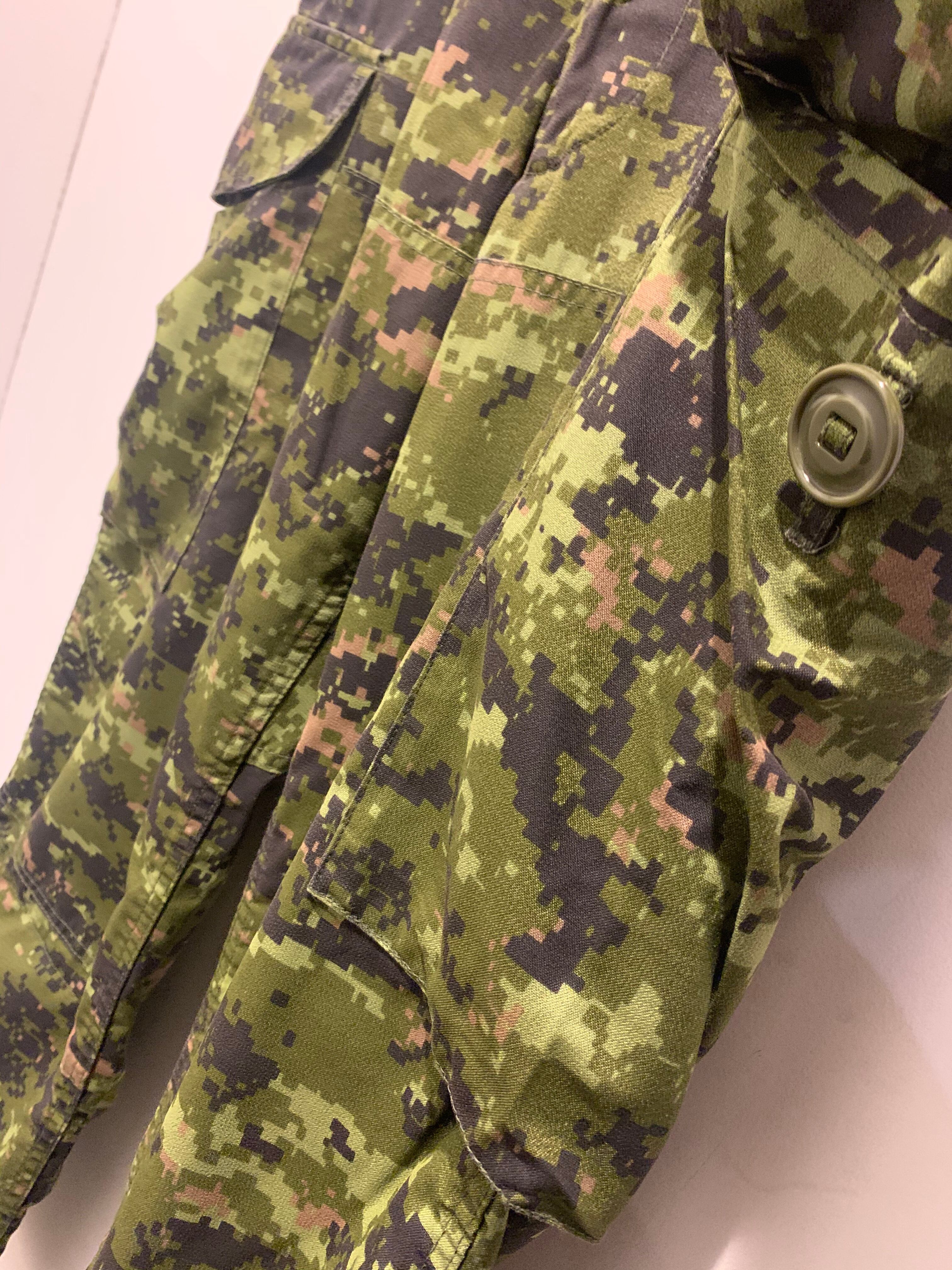 カナダ軍のミリタリーパンツです。あまり見かけないカナダ軍のミリタリーアイテムとなります。こちらは多色デジタル迷彩のパンツで現在は全世界で使われているデジタル迷彩ですがカナダ軍が発祥と言われていますね。ボタンもカナダ発祥の生地テープでボタンを縫い付けるタイプです。現在はイギリス軍なども使用していますね。ライトグリーンをベースにオリーブグリーン、ライトレッドブラウン、ブラックの四角い小さなダットで雲、葉、帯のパターンを描いています。デザインだけでは無くダブルジッパーを使用し裾にはドローコードなど機能性もバッチリな1本です。生地感も薄めなので春夏な季節にもオススメです。