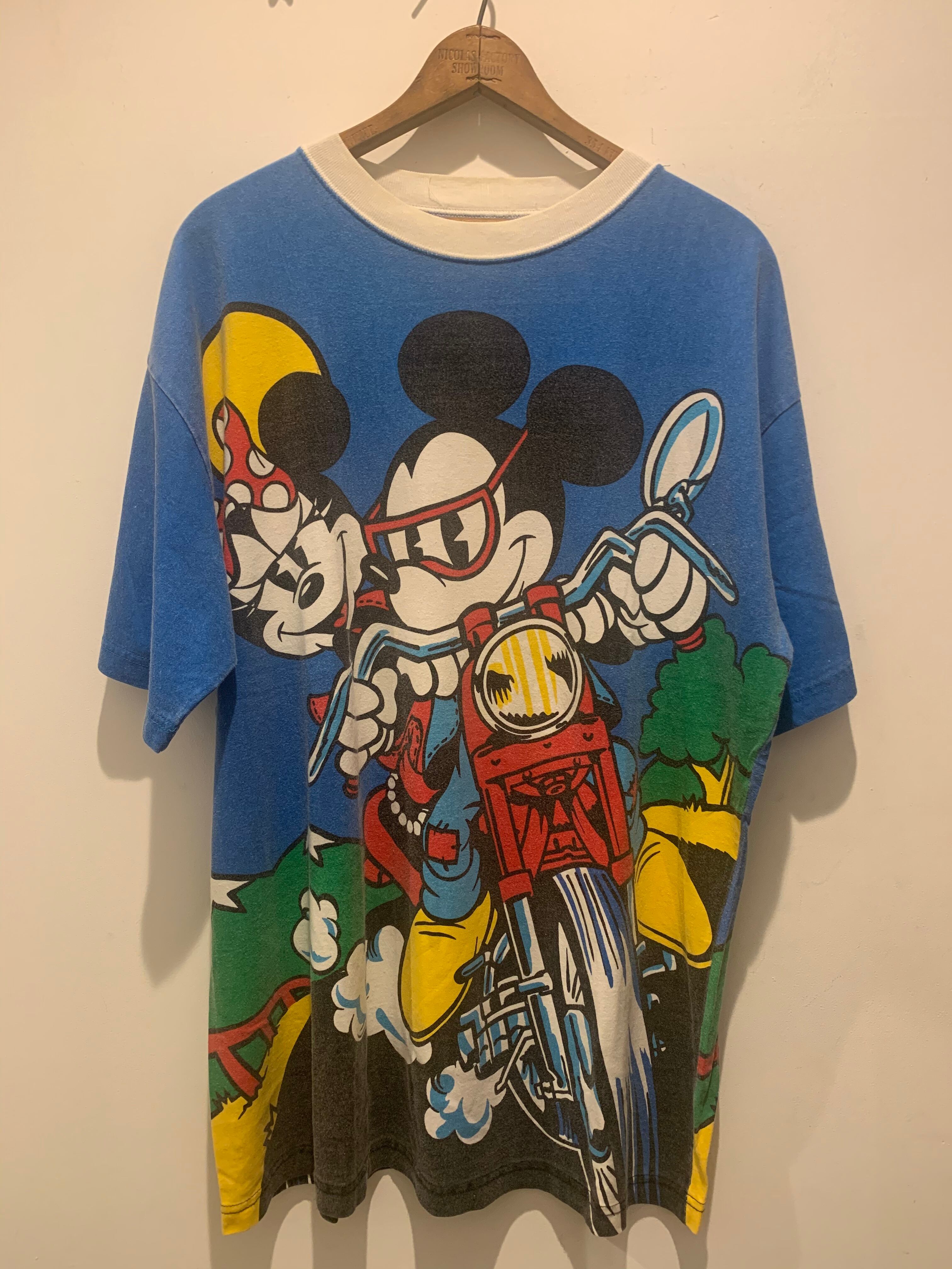 90年代のミッキー&ミニープリントTシャツです。Tシャツ全面にプリントされていてインパクトある1着です。ミッキーとミニーちゃんがバイクに乗って走っているプリントでなかなか見かけないデザインです。袖のブルーが少し色目が濃くツートンのようになっているのもポイントです。袖、裾ともにダブルステッチです。タグが無くサイズ表記がございませんがメンズのXL位の大きさでサイズ感もゆったり目で男女問わずオススメなTシャツです。