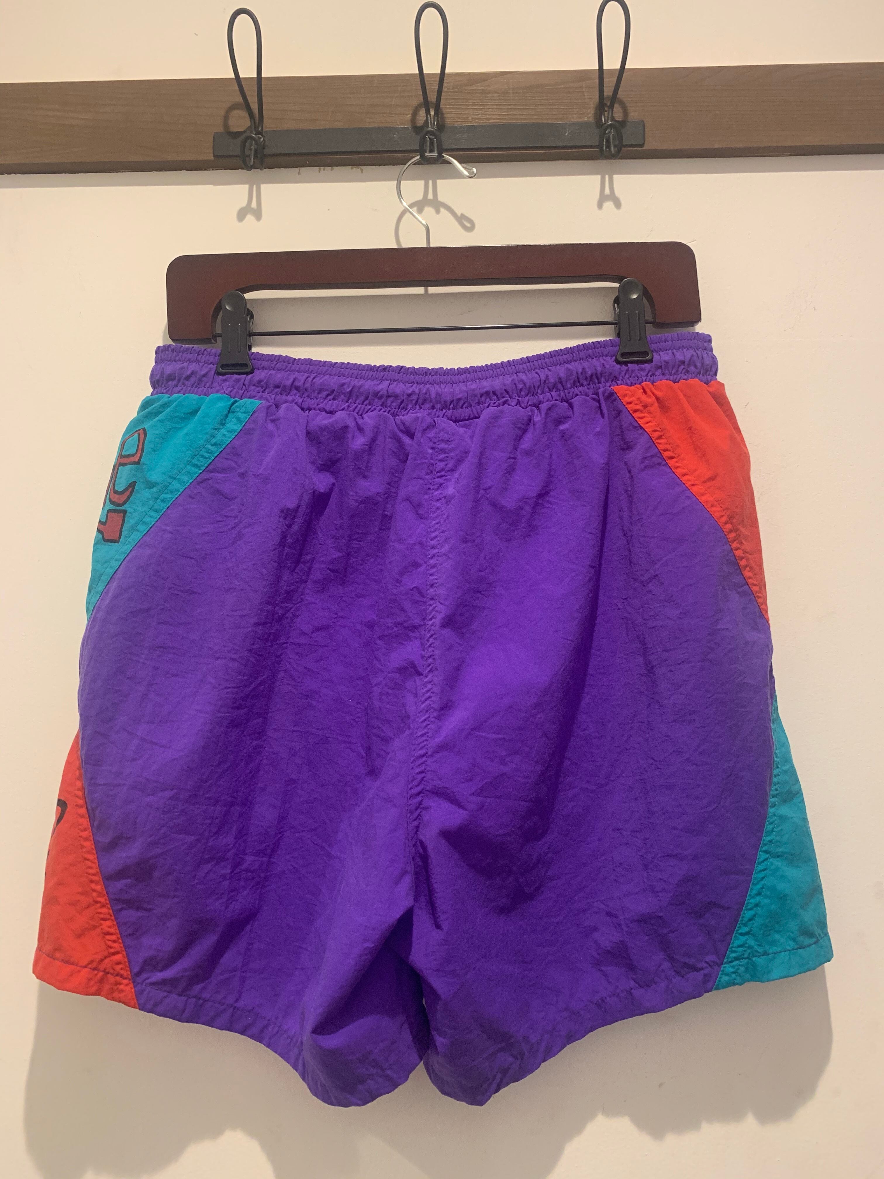 90年代オーシャンパシフィック(通称op)のショートパンツです。パープル×レッド×グリーンと90年代のNIKEにもあるカラーリングがとても良いですね。ナイロン素材でインナーにはサポーターが付いているので水陸両用で使ってい頂けます。外の紙のサイズ表記も残っていてコンディションもとても良いです。ウエストはゴム&紐付きで調整可能となっています。