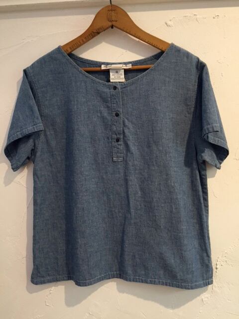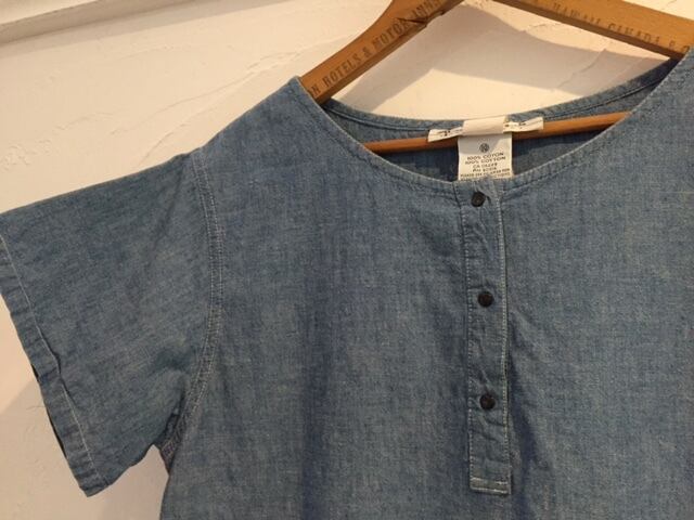 100%コットンのシャンブレー生地でこれからも着込むたびに風合いが増してくる1着です。スナップボタンのヘンリーネックでシンプルですが探すとなかなか無くOLD物ですが今の洋服との組み合わせにもピッタリです。スカートやワイドパンツに合わせてもオシャレですね。