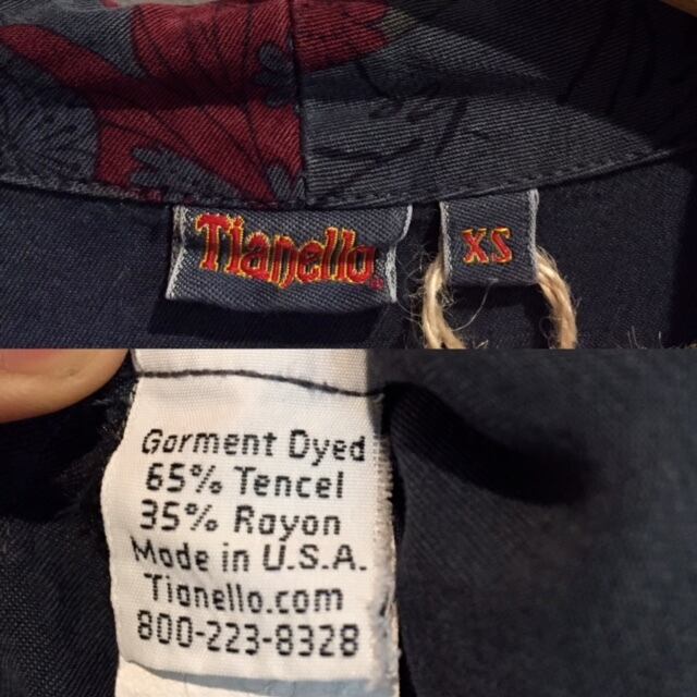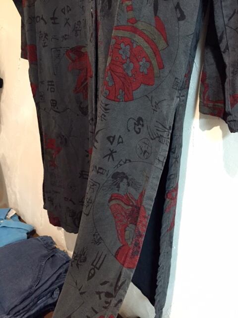 ボディカラーはチャコールグレーです。こちらは珍しくアメリカ製で和柄のデザインです。和装女性や漢字が描かれていてオシャレで他には無い1着です。3つボタンで襟はショールカラー、サイドにスリットが入ります。ボタン合わせはレディース合わせですがダーツが入っていないのでメンズも着用出来ます。個性的なアイテムがお好きな方にはイチオシです。