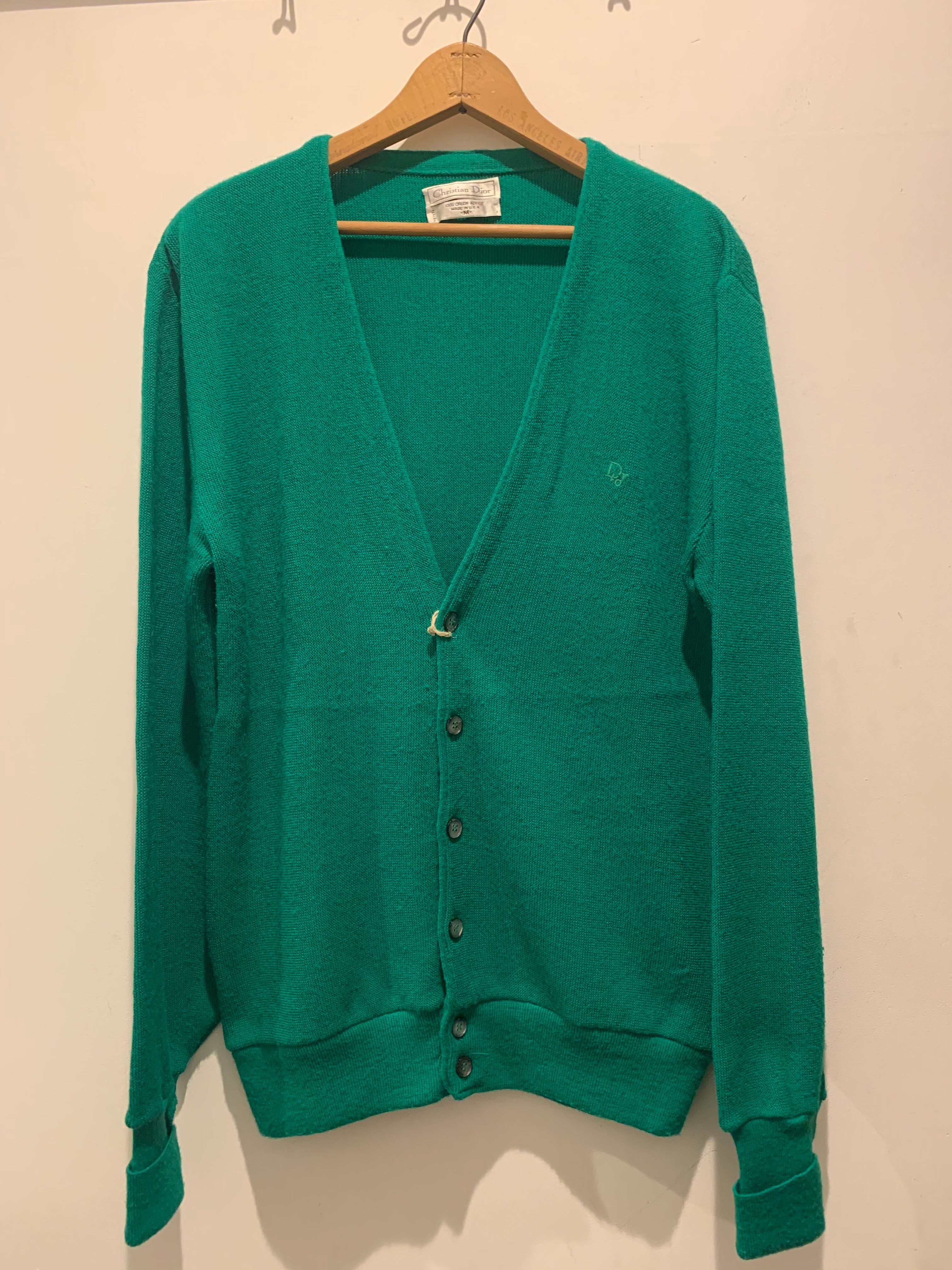80年代アメリカ製クリスチャン ディオールのニットカーディガンです。発色の良いグリーンカラーに胸のワンポイントロゴもグリーンの同色でさりげなく合わせているのが良いですね。高級ブランドだけあり質感も良い感じですね。薄手の生地感でさらっと着用できるアイテムで老若男女問わずオススメです。