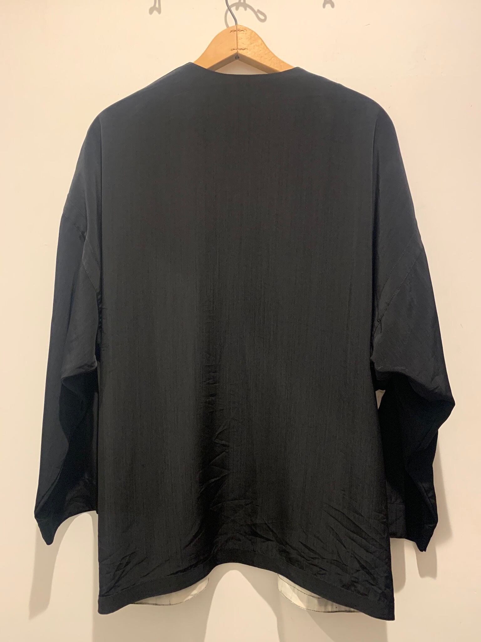 90年代カナダ製のデザインシャツカーディガンです。ブラックベースにホワイトの切り返しのデザインでハイブランドにあるような雰囲気の1着です。さらっと羽織れてリブがないのでストンと落ちるシルエットがとても良いです。ポリエステル素材ですがハリ感がありレーヨンに近い素材感でユニセックスアイテムとしてオススメです。