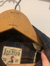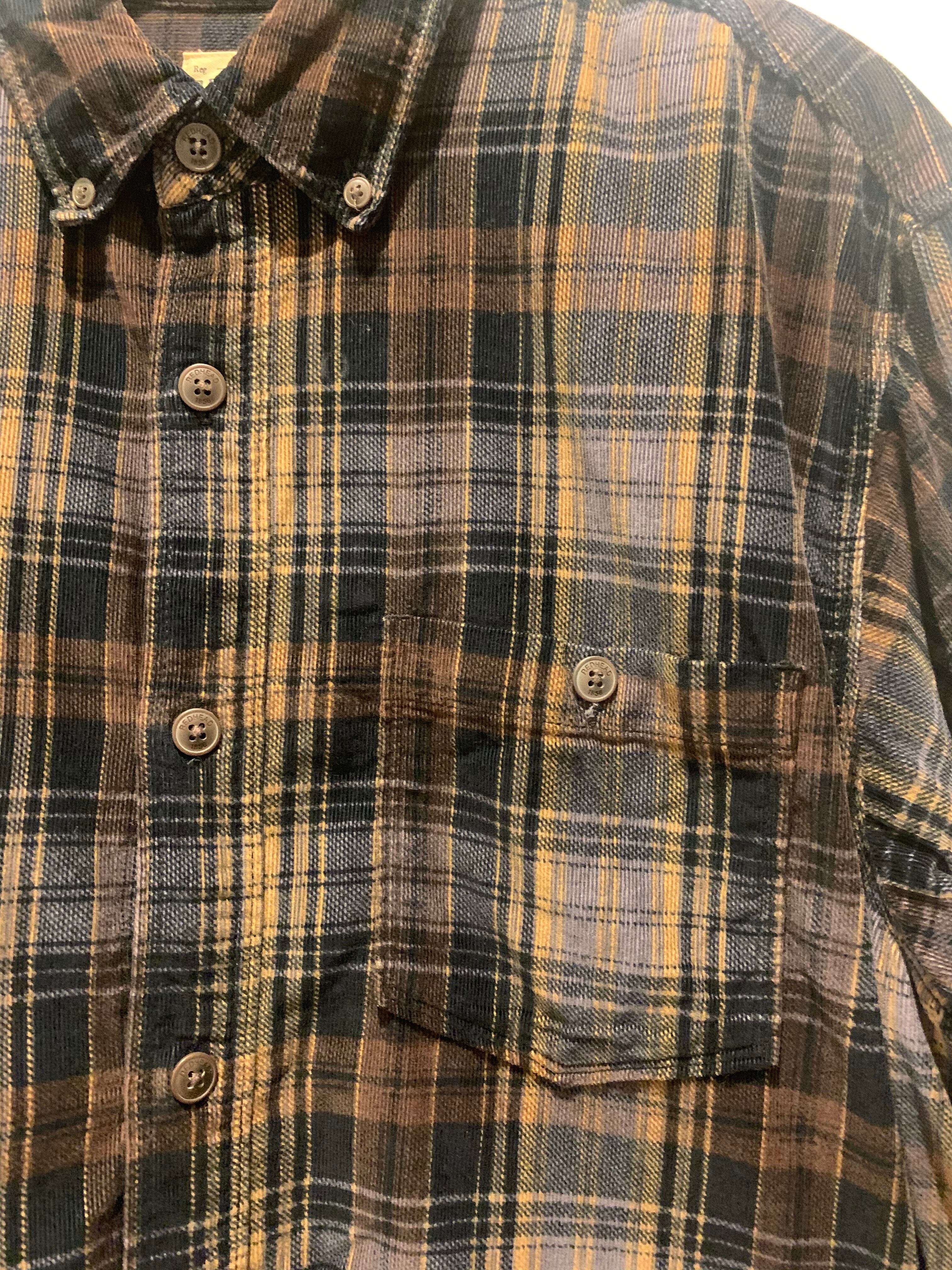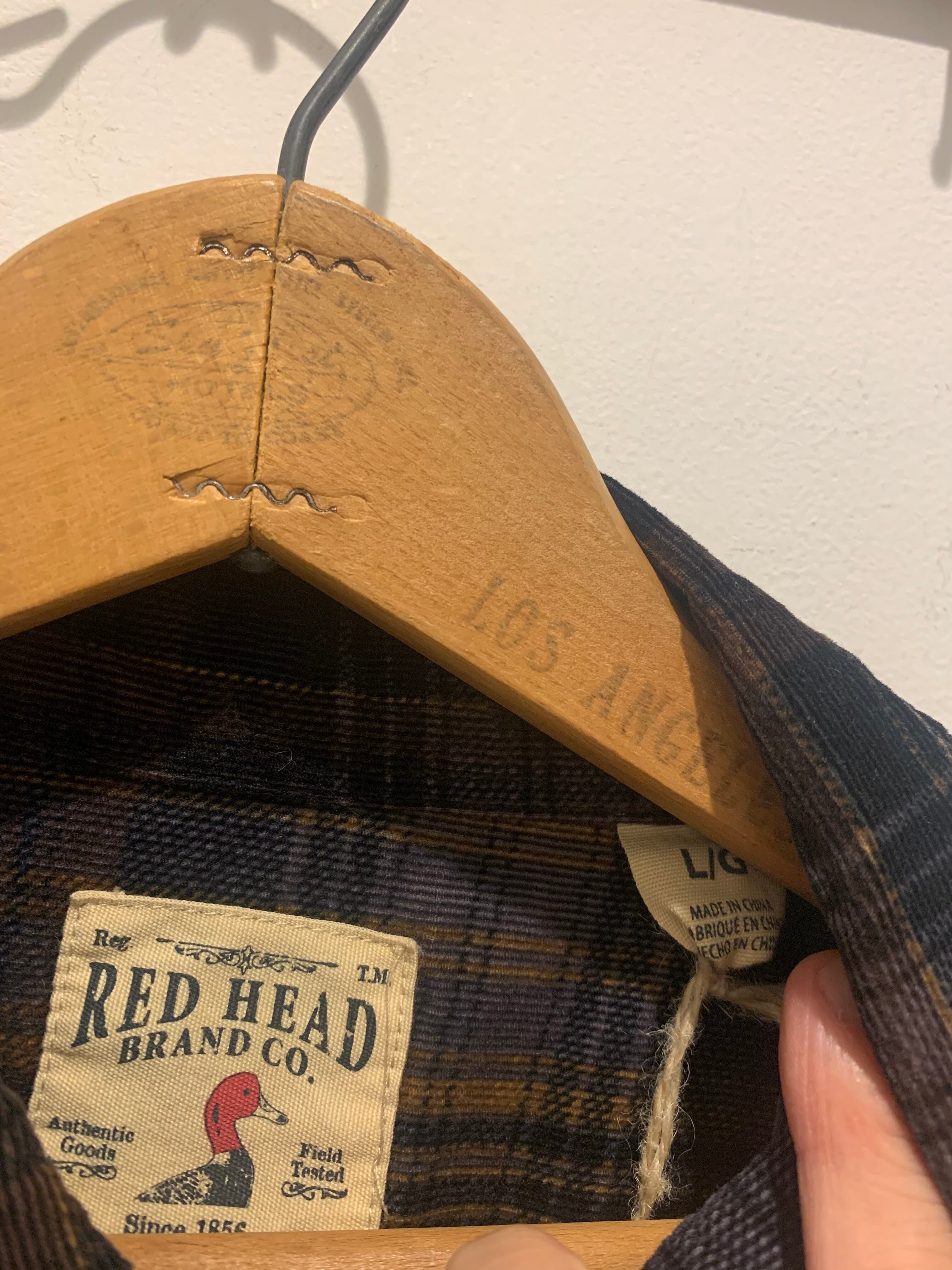 レッドヘッドのコーデュロイシャツです。ビンテージハンティングアイテムが有名なレッドヘッド。こちらはコーデュロイシャツで無地のは多く見かけますが珍しいチェックのコーデュロイとなります。配色もブラック×ブラウンで色味がとても良くボタンにも刻印がございます。近年物アイテムとなりますが探すとなかなか無くオススメです。