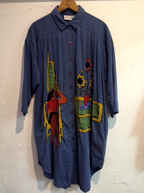 カラーはネイビーです。フランスの有名な画家ゴーギャンの様なイラストがチェーンステッチで描かれている1点物アイテムです。女性の絵がへたうまな感じがまた良いですね。閉めてワンピースの様に着たり、ボタンを開けてロングシャツの様に着ても頂けます。サイドにポケットがあるのも嬉しいポイントで8分袖位です。