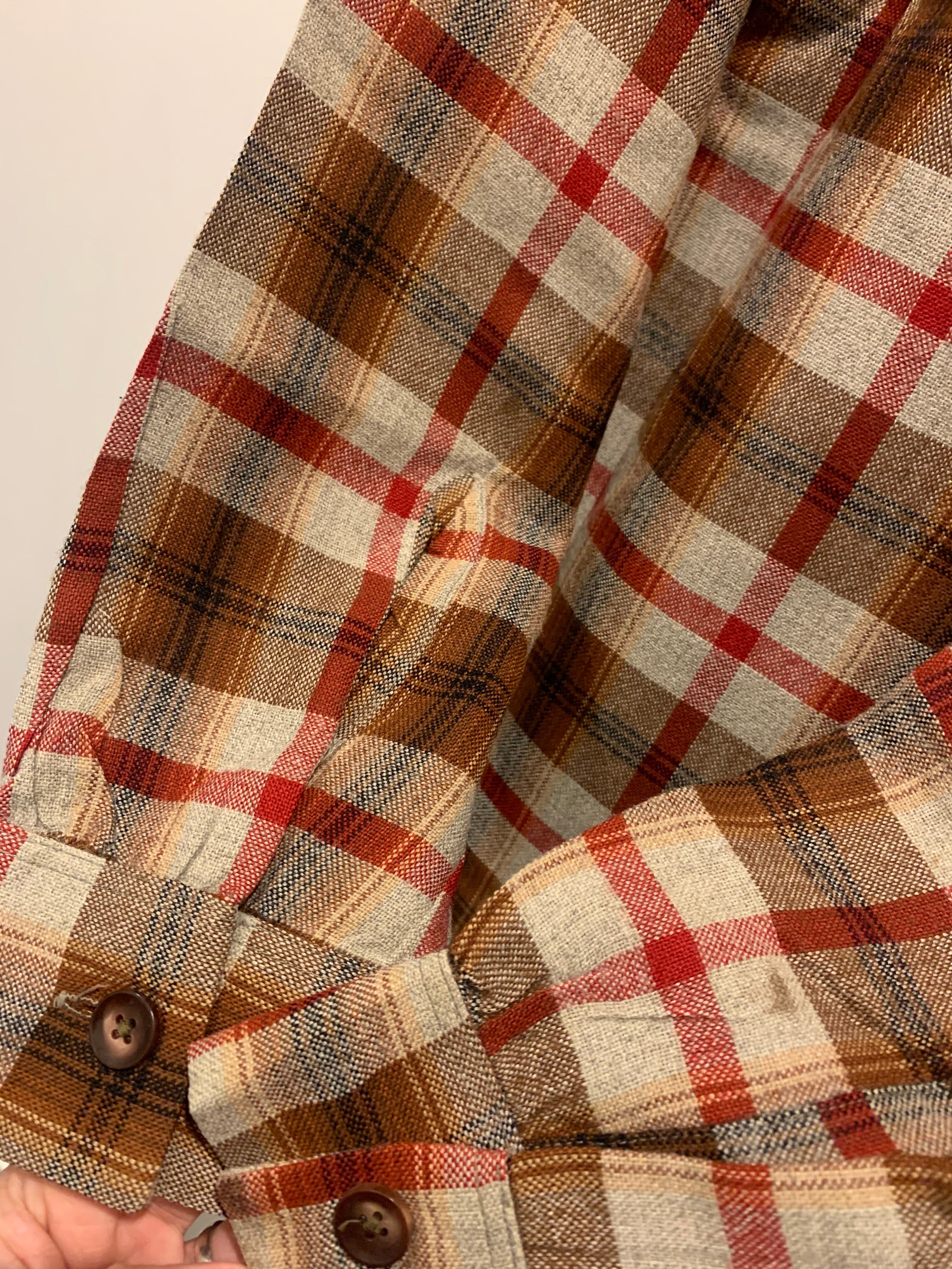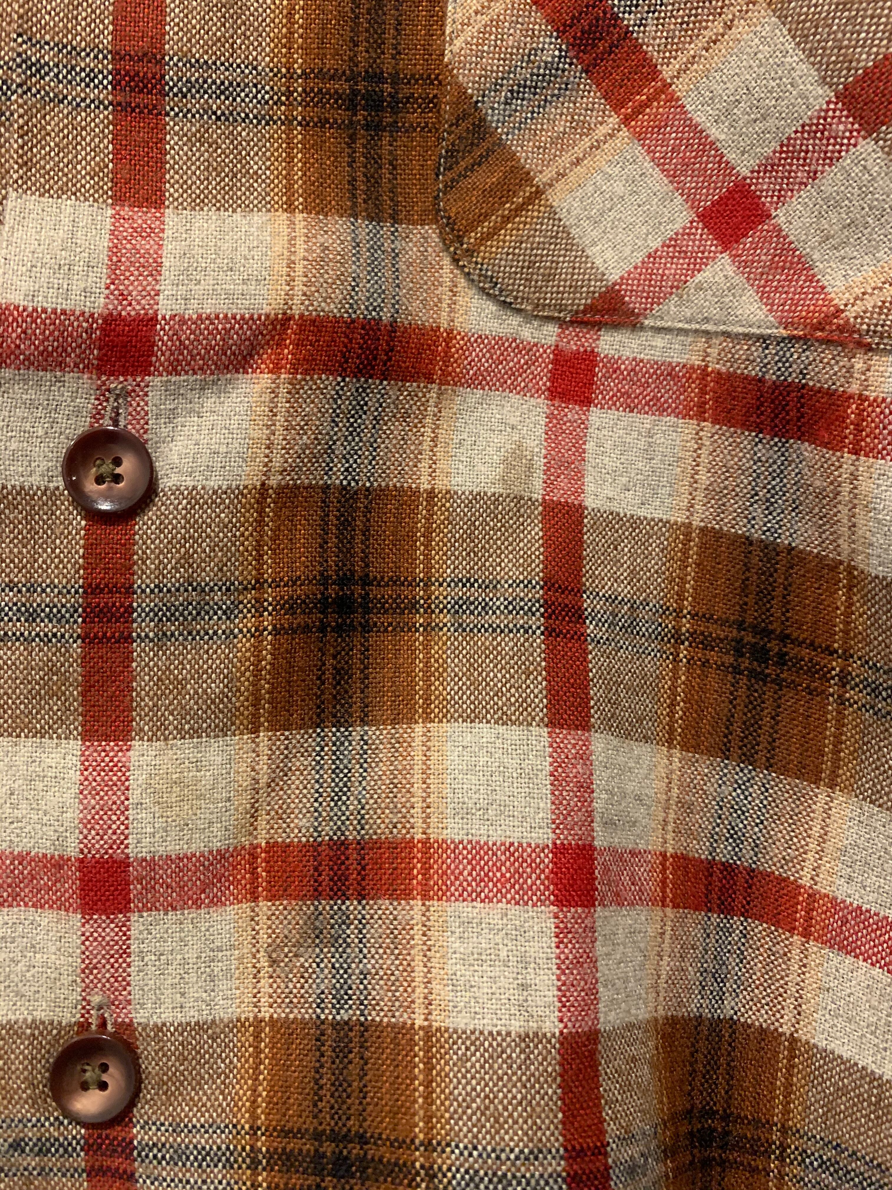 60年代ビンテージのウールシャツです。ブラウン×ベージュ×レッド×ブラックと配色の良いチェックです。トップはループでフラップ付きポケット、ボタンも当時のオリジナルで全て揃っています。ボックスシルエットで縮みも無く形が綺麗に残っているのもオススメです。デニム・ミリタリーパンツ・スラックスどれも相性が良さそうですね。
