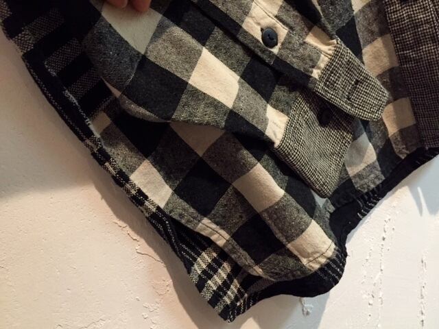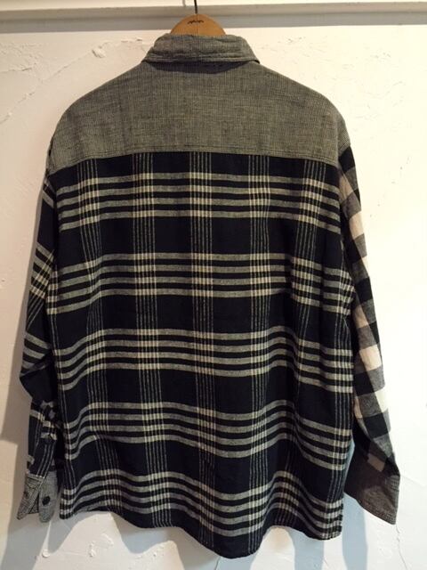カラーはブラック×ホワイトです。こちらはブロックチェックや千鳥格子など贅沢に使用したモノトーンベースのパッチワークがオシャレな1着です。素材もシルク100%で肌触りがとても良くオールシーズン使えるロングスリーブシャツです。袖をまくって着たり腰巻きしても良いですね。