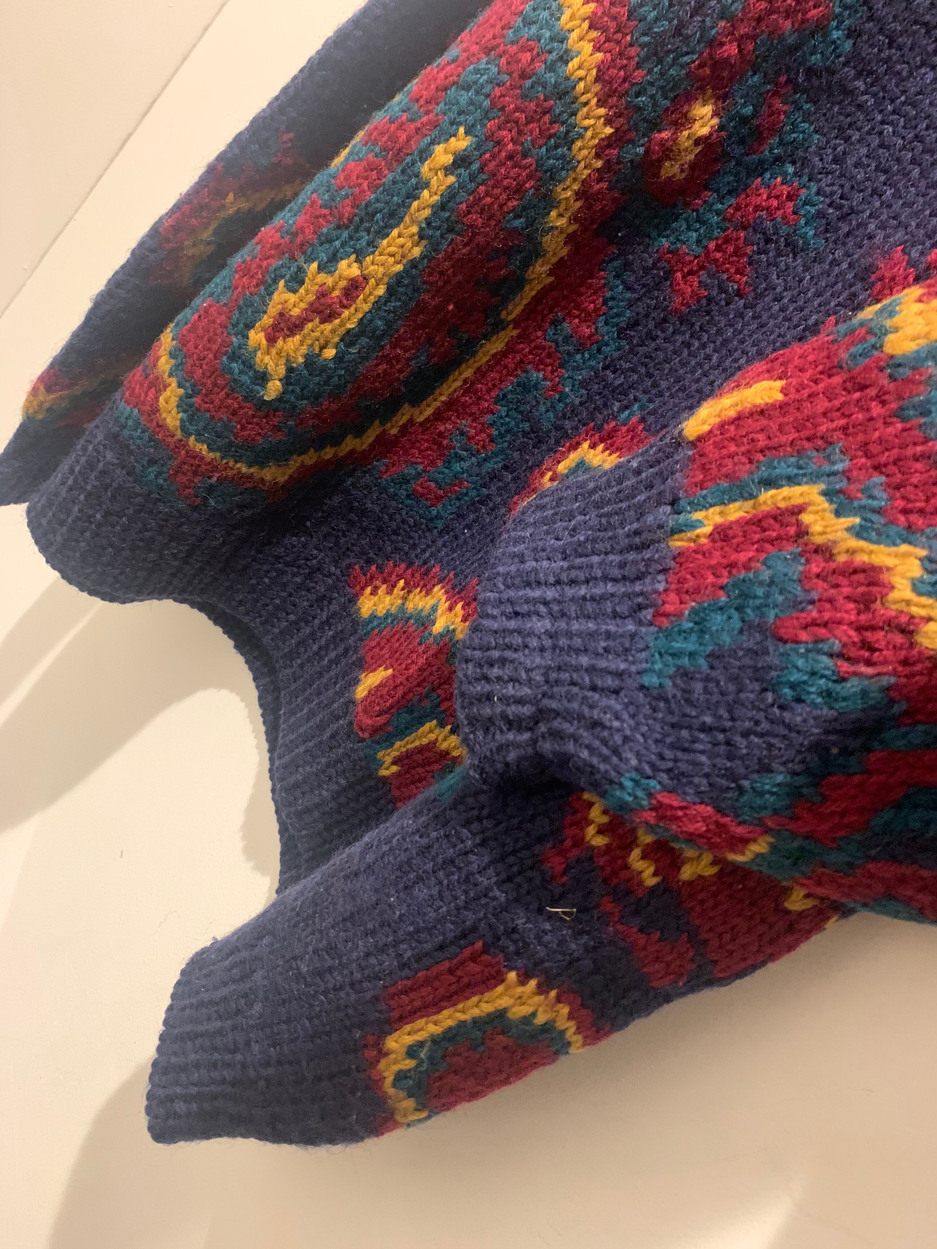 90年代ペイズリー柄のニットです。シャツやスカート、ワンピースでは見かけることが多いペイズリー柄ですがこちらはニットとなります。また総柄ですがペイズリー柄が大きくデザインされていてこのパターンはより見かけなく珍しいデザインですね。ネイビーベースに柄の配色も良く男女問わずオススメなアイテムです。