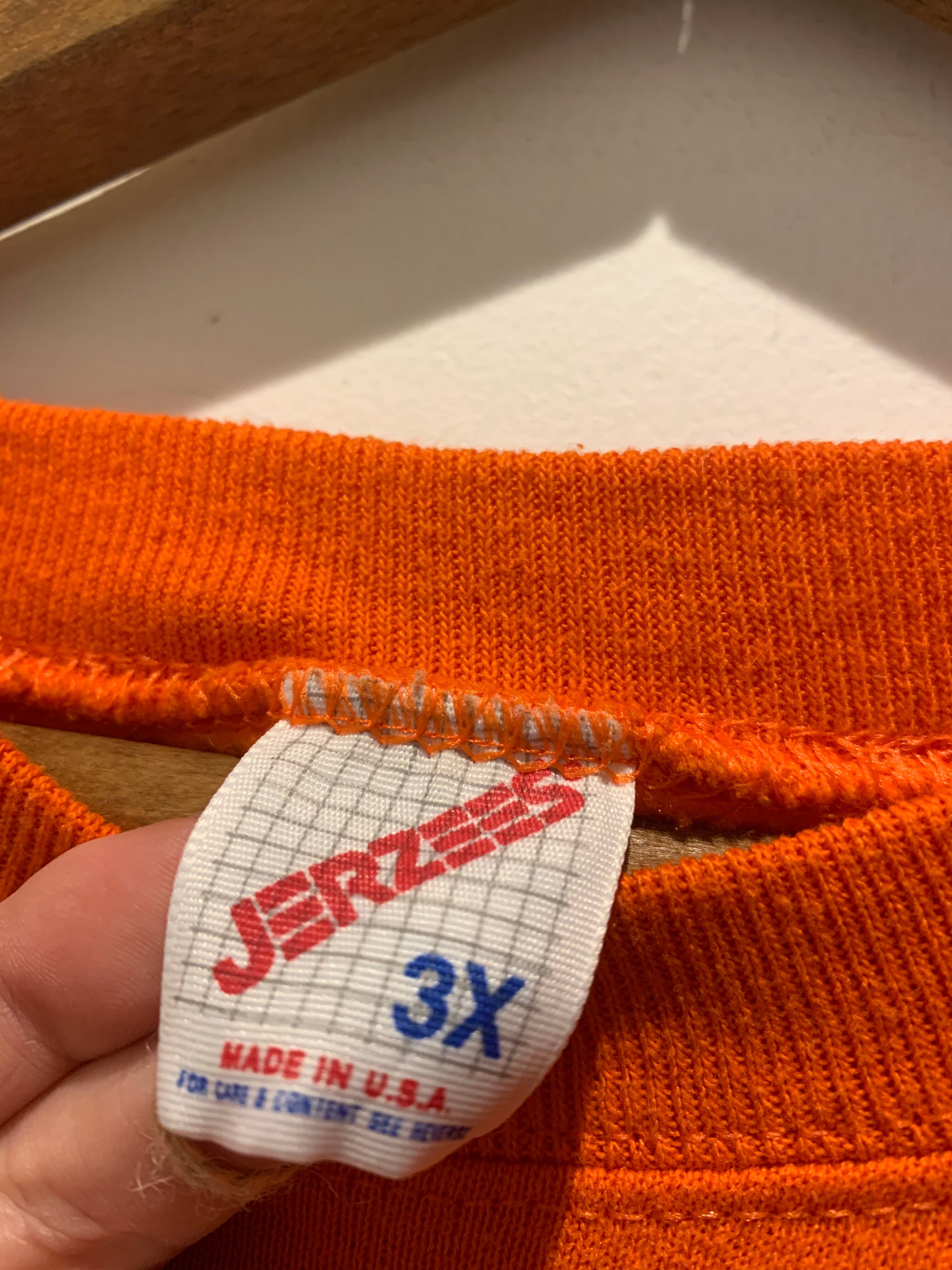 80年代アメリカ製ジャージーズのスウェットです。カラーは発色の良いオレンジカラーです。この年代のスウェットは作りが小さい物が多いのですが、こちらは3XLと希少な大きめなサイズ感です。無地でシンプルなアイテムなのでアメリカ製やサイズ感にこだわりたいですね。差し色としても大活躍でコンディションも良く男女問わずオススメです。