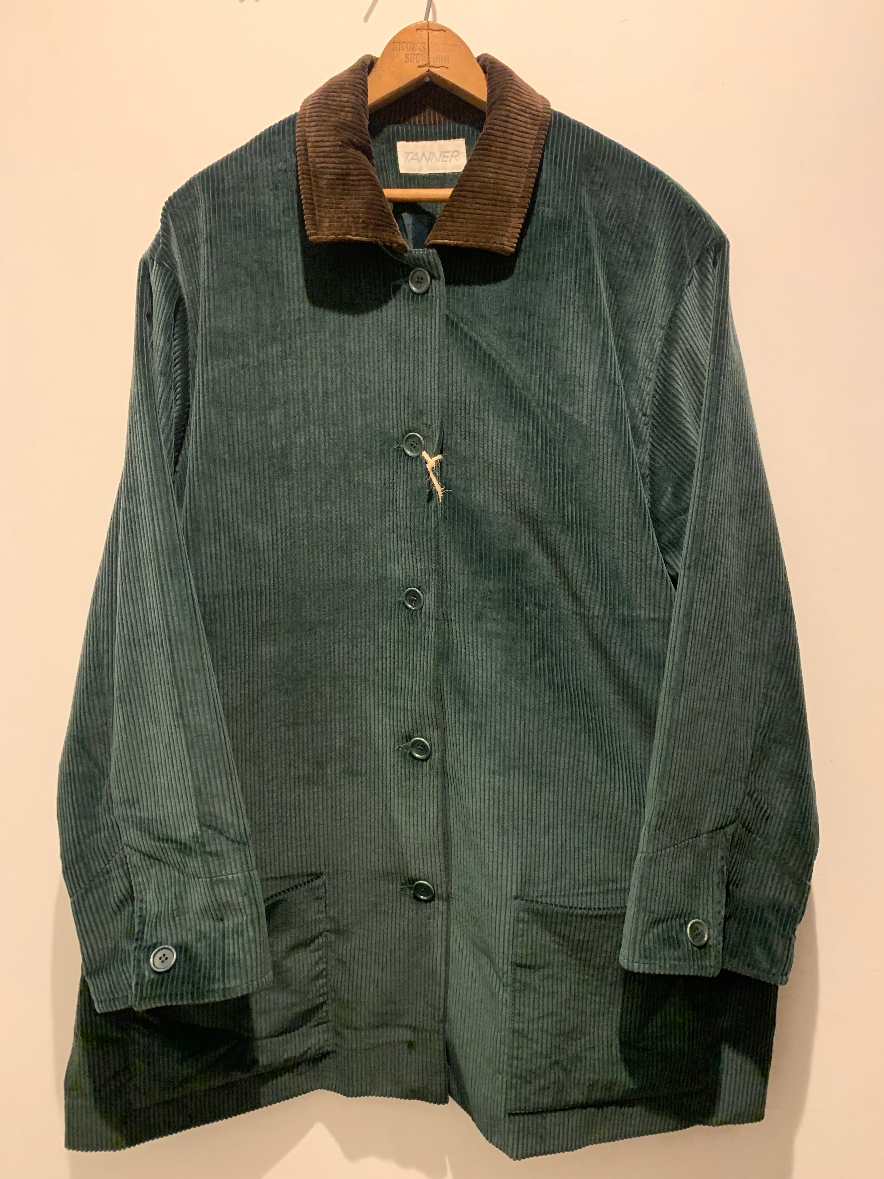 90年代アメリカ製のコーデュロイジャケットです。ボタン合わせがレディース合わせですがかなり大きめの作りでメンズのXL位のサイズ感です。ダークグリーンの太畝コーデュロイで襟と袖を捲った時のブラウンカラーがアクセントになっています。カバーオールのようなショップコートのような形がとても良くグリーンで合わせたボタンもポイントです。嬉しいアメリカ製でユニセックスで着用できて男女問わずオススメなアイテムです。