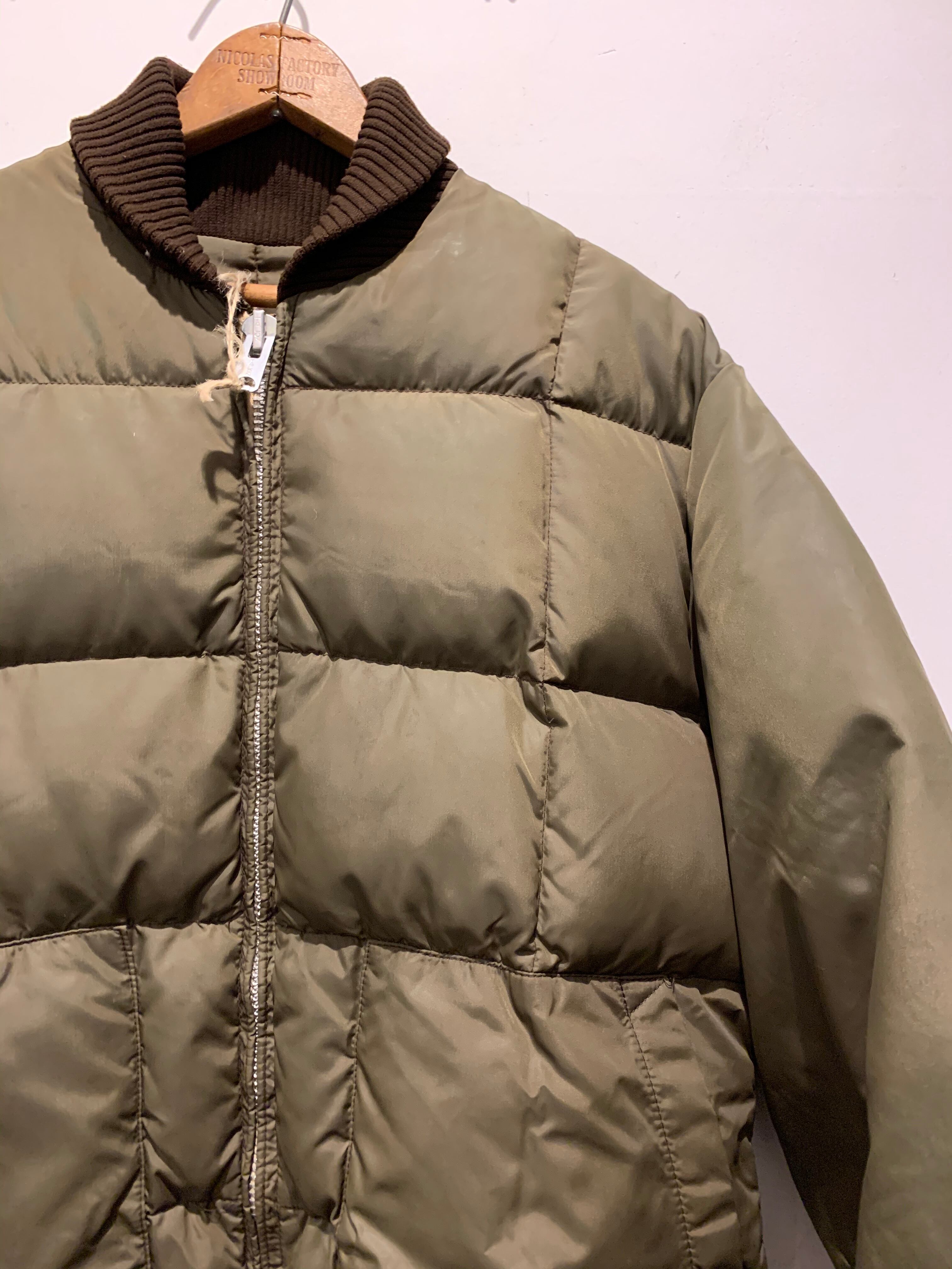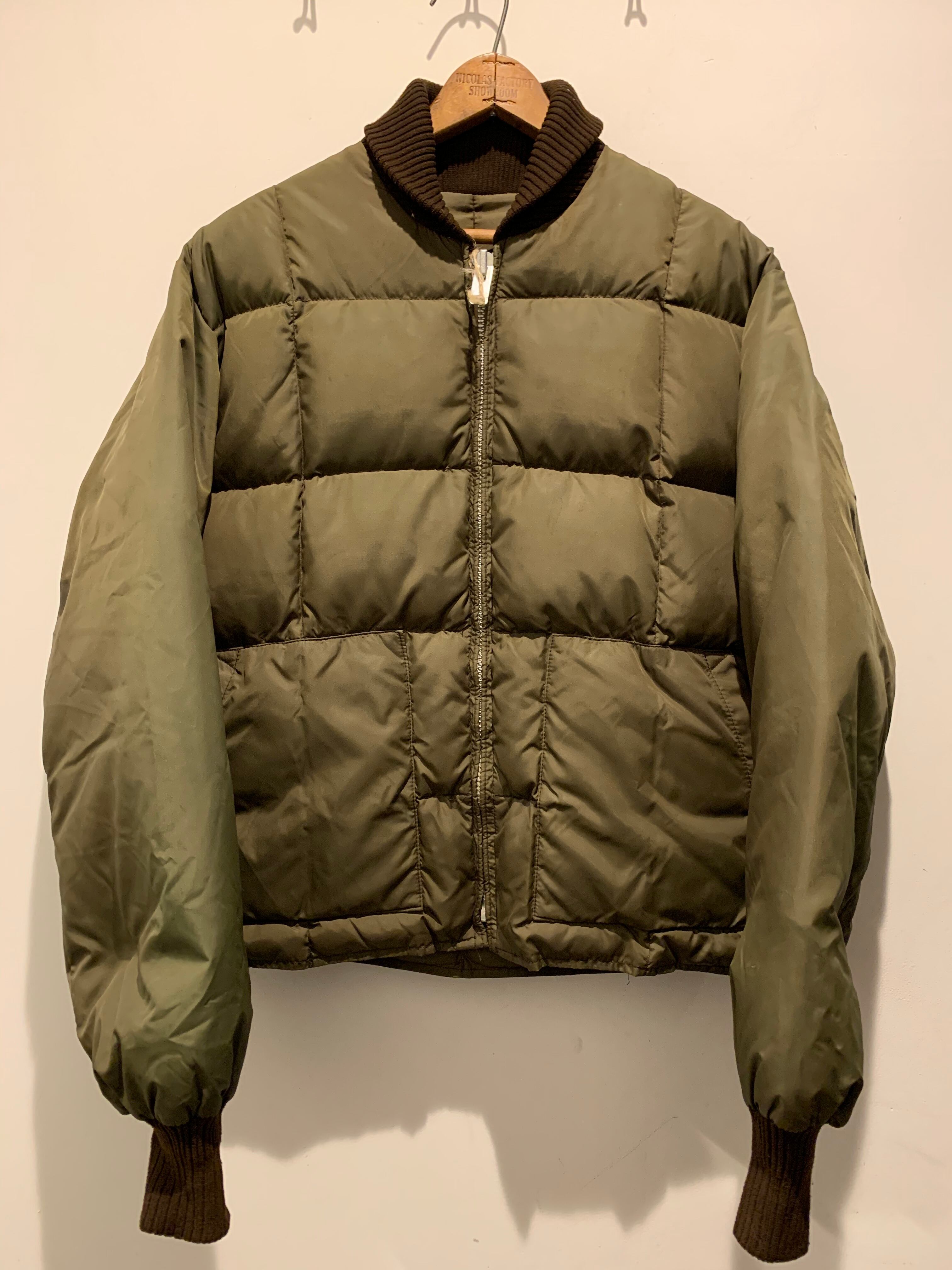 70年代アメリカ製ミラーのグースダウンです。オリーブとブラウンの中間のような良い色味となっています。ダウンの抜けも少なく着用するとスッキリと見えますが暖かさもあります。アルミのTALONジッパーもアクセントになっていますね。短めな丈に少し幅広なシルエットが良く男女問わずオススメなアイテムです。