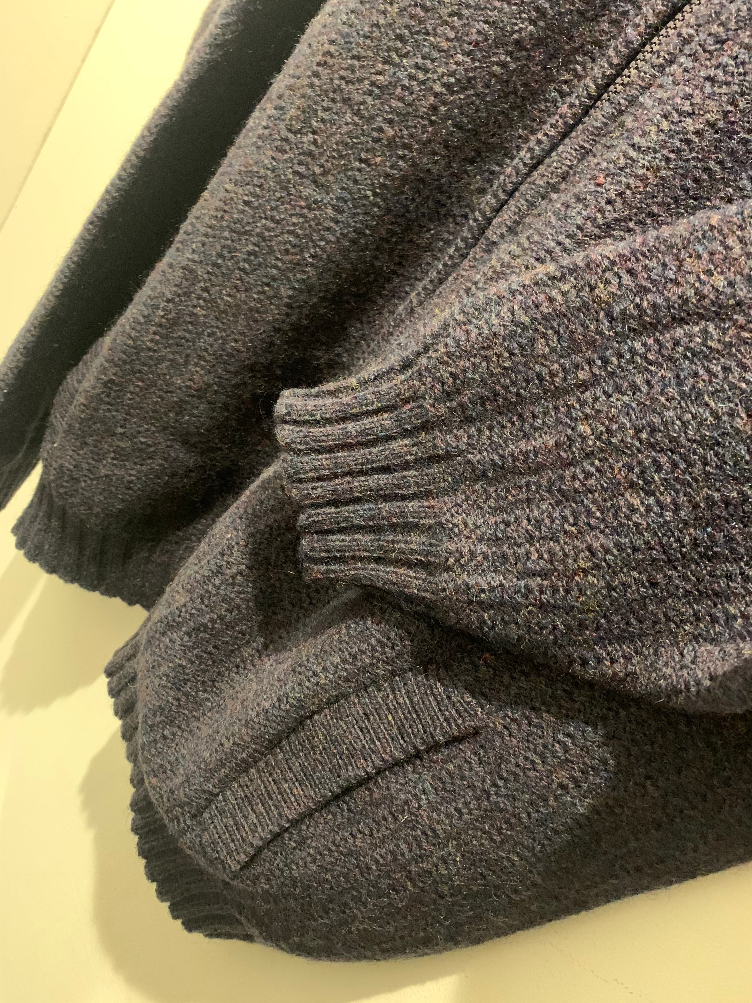 70年代アメリカ製L.Lビーンのジップアップニットです。ネイビーベースにパープルが混じった色味でとても良いカラーリングとなっています。スタンド襟でサイドポケットが付いているのもポイントですね。大きめなサイズ感でメインでもアウターのインナーとしても使えて便利な1着です。老若男女問わずオススメです。