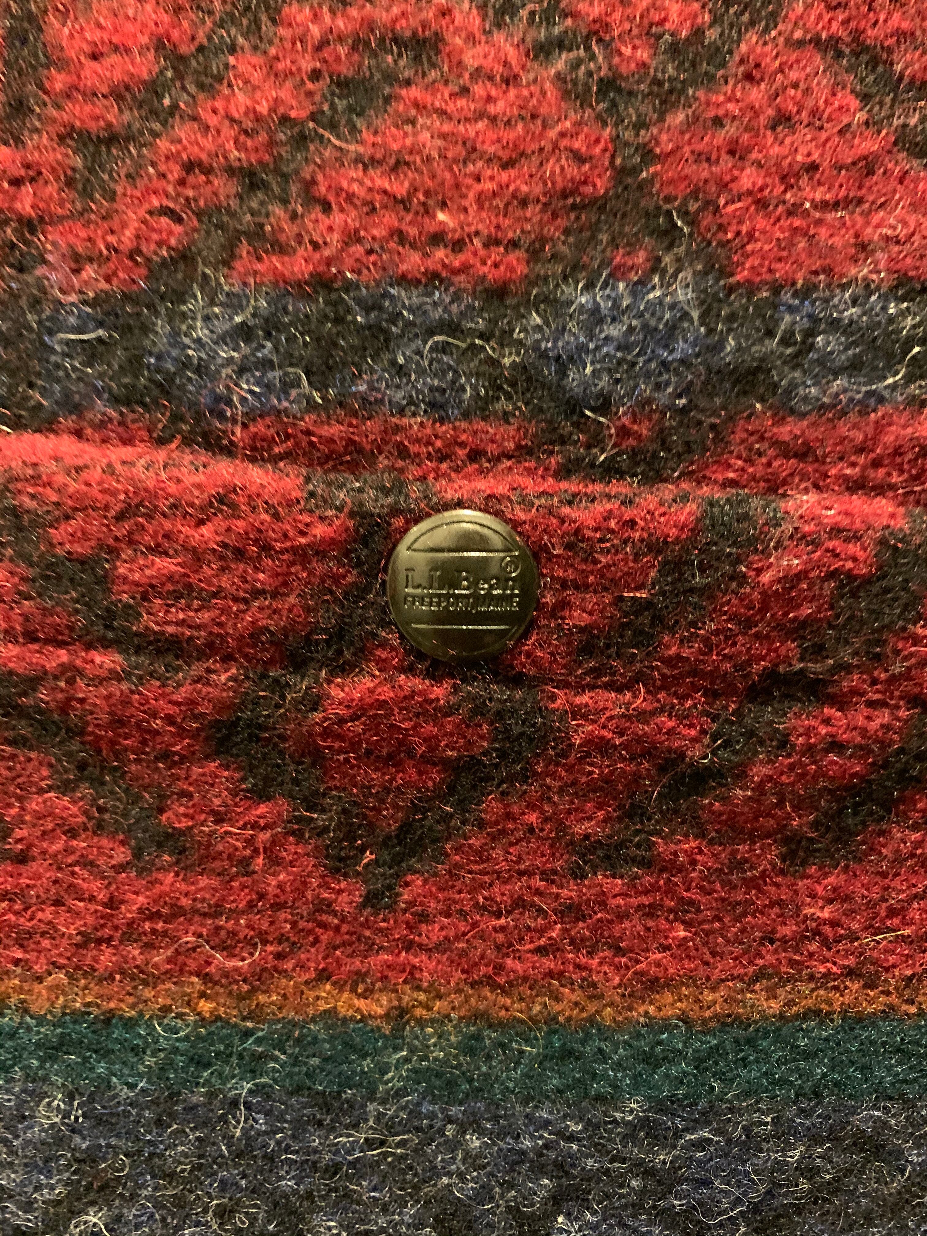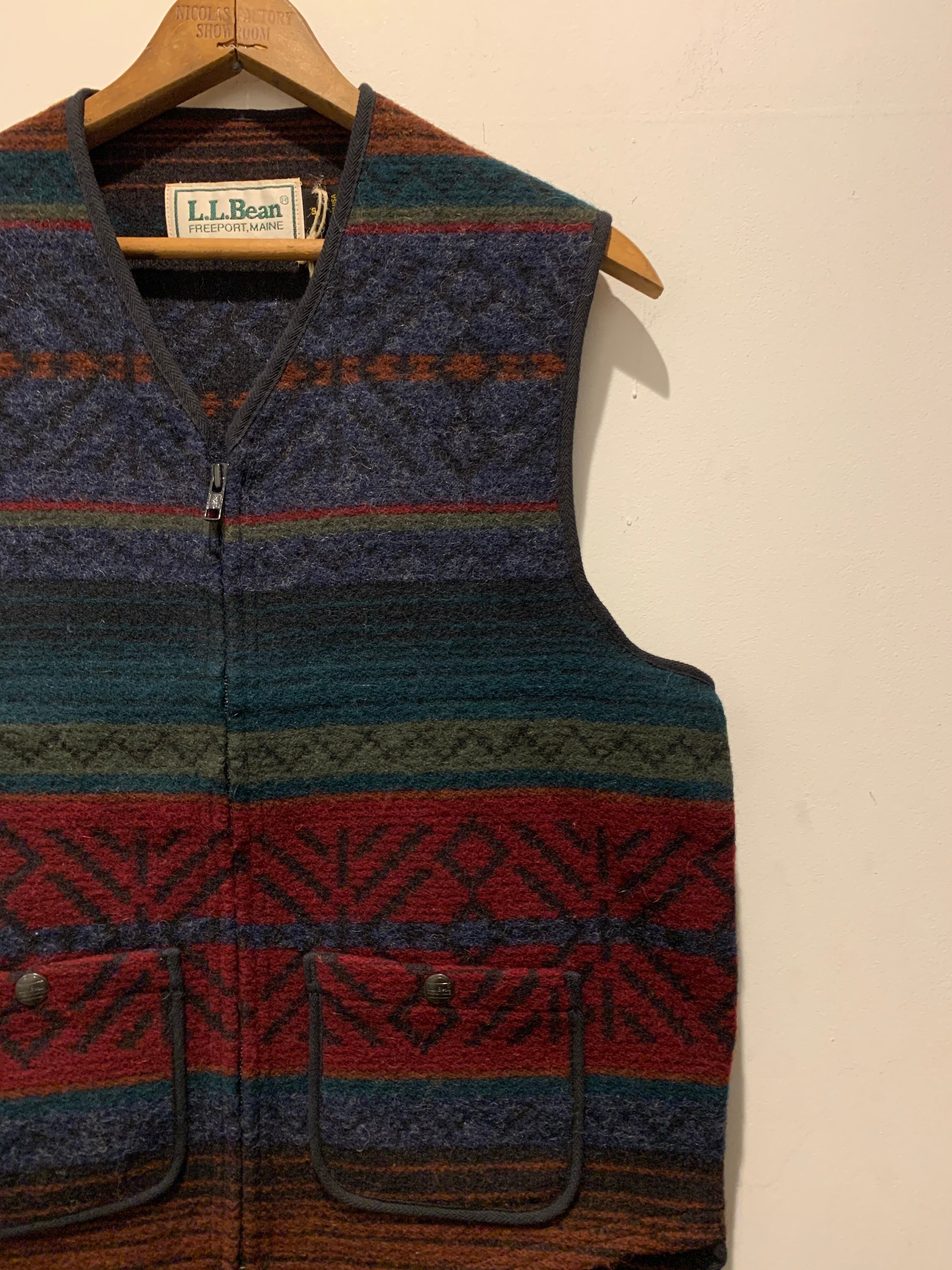 80年代アメリカ製L.L.ビーンのウールベストです。ネイティブパターン×ノルディックパターンが合わさり配色もとても良い1着です。ジッパーはYKKでバッグにシンチバック付き、またボタンが黒ラッカーという所がポイントですね。様々なレイヤードにも使えてメンズSサイズでコンディションも良く女性のお客様にもオススメです。