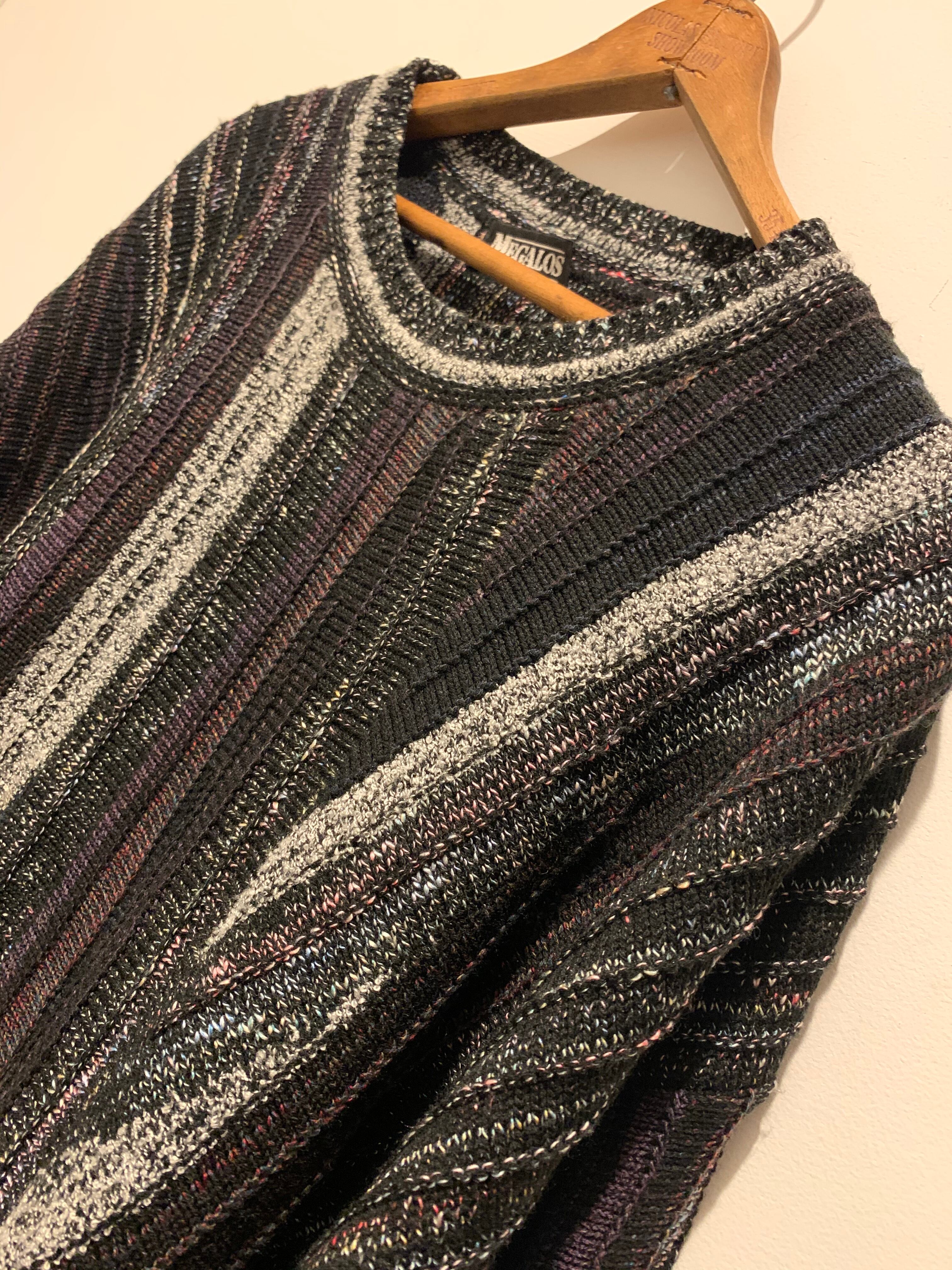 90年代アメリカ製デザイン3Dニットです。一見落ち着いたカラーリングですが良く見るとカラフルな糸も使っていてそこがアクセントになっています。3Dニットは手間が掛かる為、当時でも高級なアイテムとして扱われていますがUsedならではのプライスです。アメリカ製というのも嬉しいポイントでサイズ表記はございませんがゆったりなサイズ感で男女問わずオススメなアイテムです。